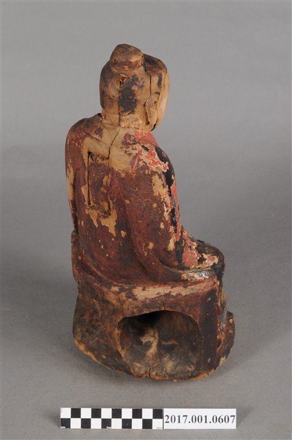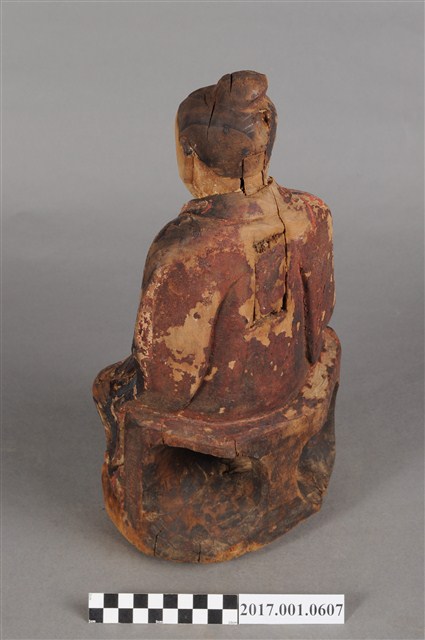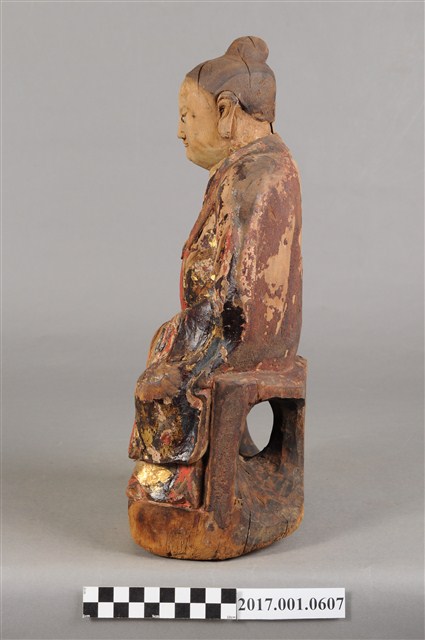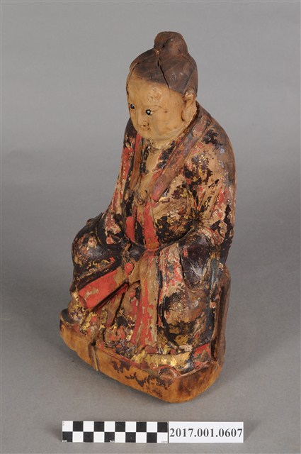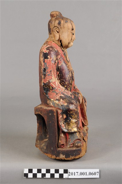 1.本件木雕法師像,採坐姿姿態,坐在圈背椅上,表面施作塗裝、安金粧佛技法,粧佛剝落嚴重,神像的腦後、後背皆開有長方形入神洞,封榫尚存。法師像作男子相貌,臉形橢圓,眼珠為鑲入珠石,鼻下、兩頰有植鬚孔,鬍鬚脫落遺失。頭頂梳髮髻,身著右衽長袍,外罩開襟法袍,法袍在腹前綁結,腳穿鞋。挺身盤坐,雙足垂下,雙手藏於衣袖內環抱於腰際,作抱壽(袖)體(通壽體)姿勢。