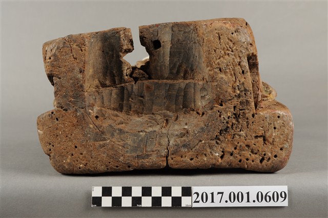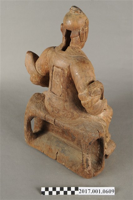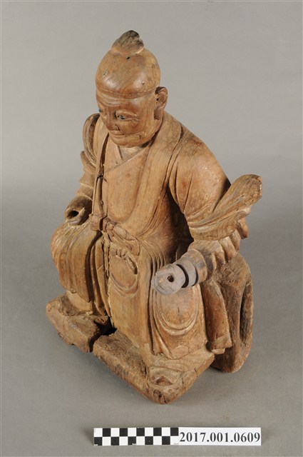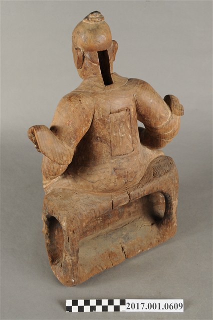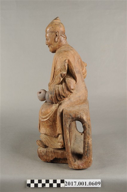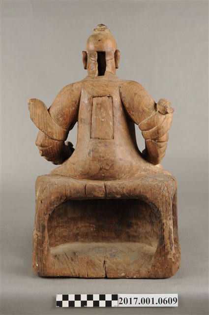 1.本件木雕法師像,作坐姿姿態,正面於腹部、背面於頭部與背部皆開有長方形入神洞,內容物件已取出,表面粧佛已褪去。顏面表現抬頭紋,雙目張眼,眼珠為珠石鑲嵌,展現老年男性面容。頭戴圓巾,身著右衽窄袖長袍,腰繫布帶,長袍外罩對襟法袍,雙腳套履。端坐,身軀前傾,雙手握拳持物分置於腿上,持物已失。