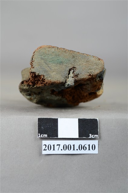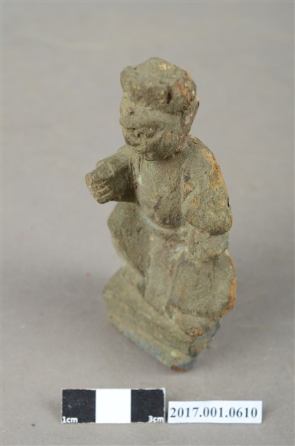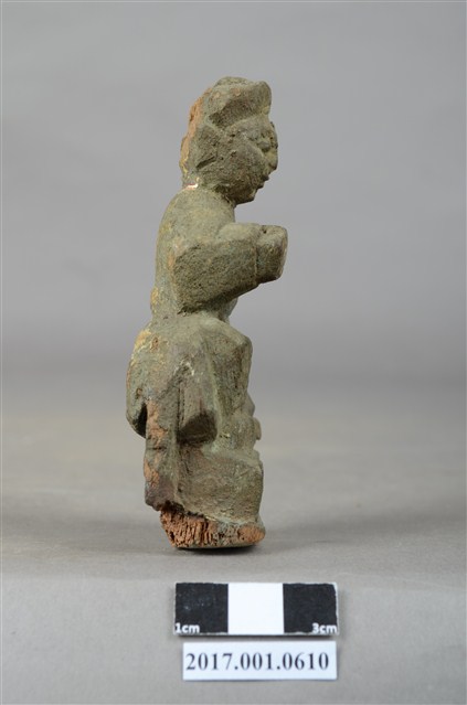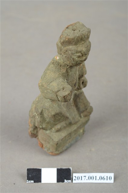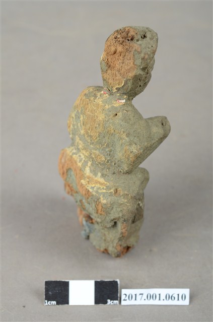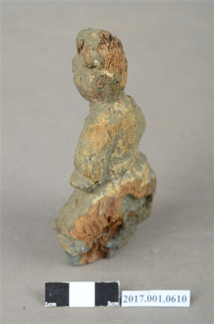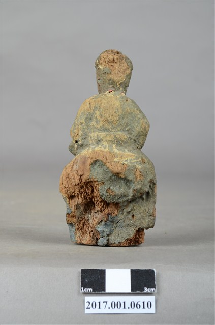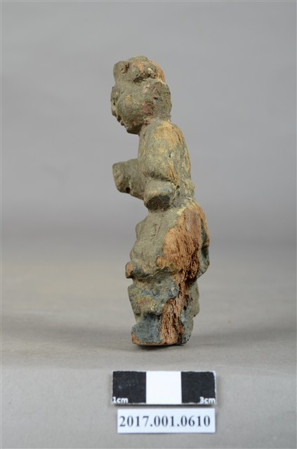 1.本件木雕法師像尺寸微小,雕工簡潔,法師像採坐姿,端坐於臺座上,表面粧佛已褪去,通身佈滿污漬,右手自手腕處缺損,臺座左後方蛀蝕。法師作中年男子相貌,無鬚,雙眼圓睜,頭戴扇形法冠,身著斜襟法服,腰間束腰帶。右手小臂向前上舉,手掌缺損,左手虛握置於左膝上,雙足踏於座前踏几上,左足稍向外伸。