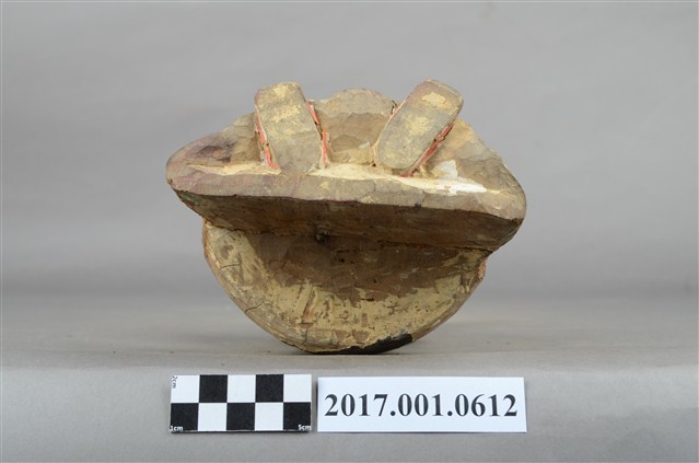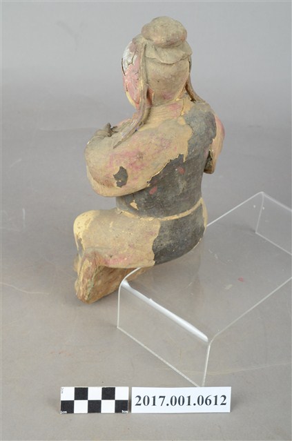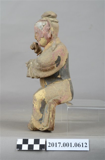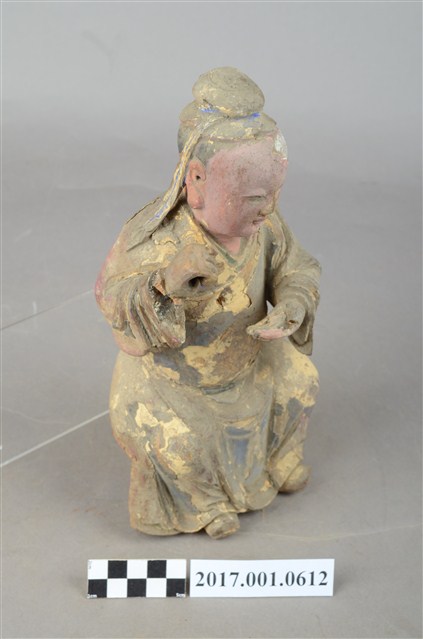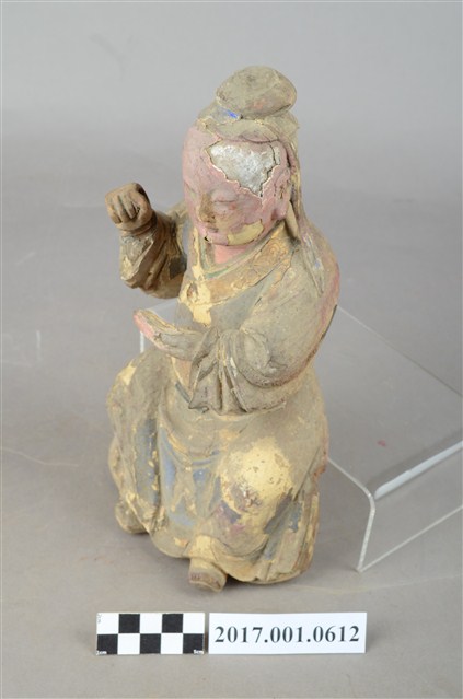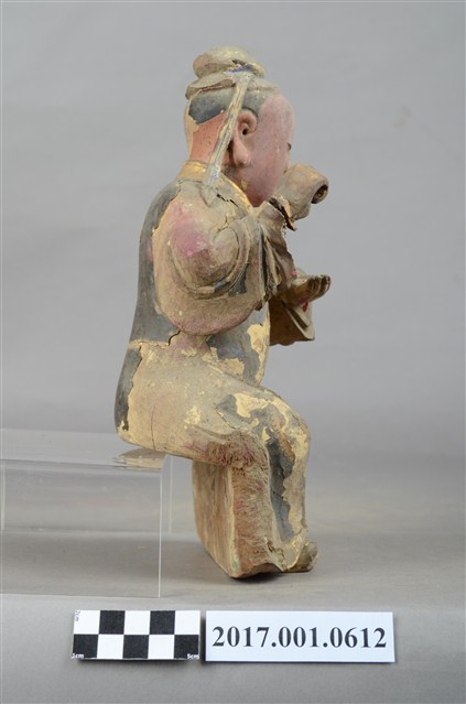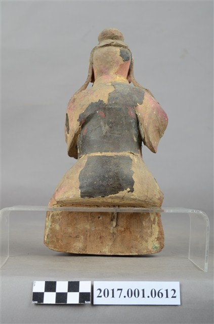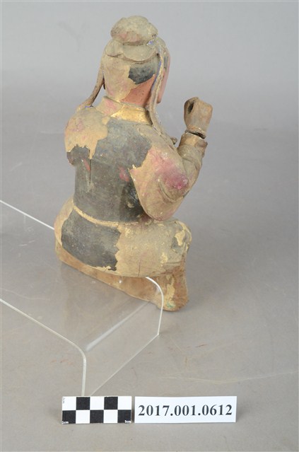 1.本件木雕法師像採坐姿,座椅已失,表面局部褪去並佈有污漬,袍服以黑色為主。法師作年輕男子相貌,絳紅臉色,無鬚,面目清秀,頭頂梳單髻束布巾,巾帶垂於兩肩之上,身著斜襟法服,腰間束腰帶,胸前一朵漆線寶相花紋飾,衣襟殘留漆線。右手小臂上舉,手掌虛握,手中持物已失,左手向內平伸,掌心朝上,手指伸直,作捧物狀。