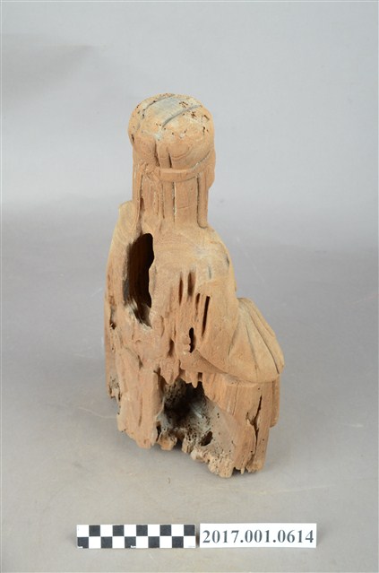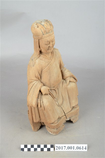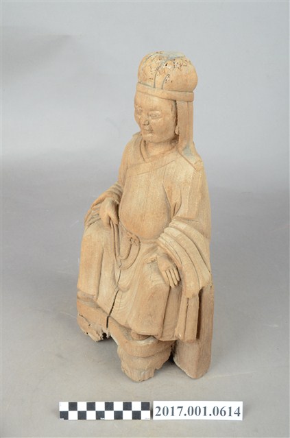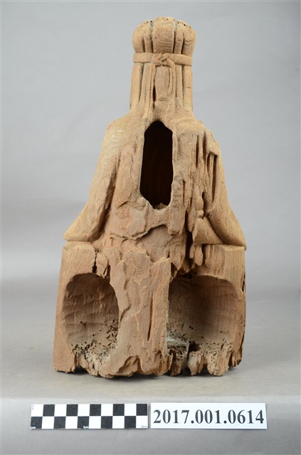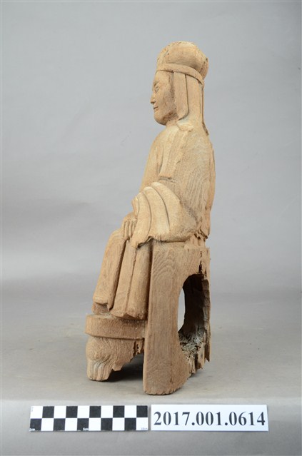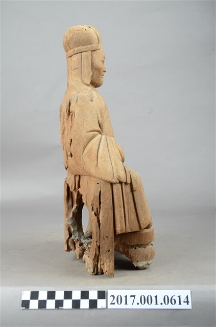 1.本件木雕法師像,雕工流暢,面部表情生動,法師像採坐姿,端坐於無背方臺上,表面粧佛已除去,右腹一道縱裂紋,延伸至踏几中央,背後開有長方形入神洞,內容物件已取出,臺座後方蛀蝕。法師作中年男子相貌,無鬚,頭戴法巾,束頭帶,巾之後端垂於頸後,身著斜襟法服,腰間繫腰帶,結盤長結。左手虎口張開,扶於左膝之上,右手握腰帶,雙足踏於座前踏几上。