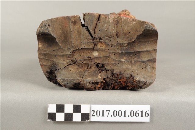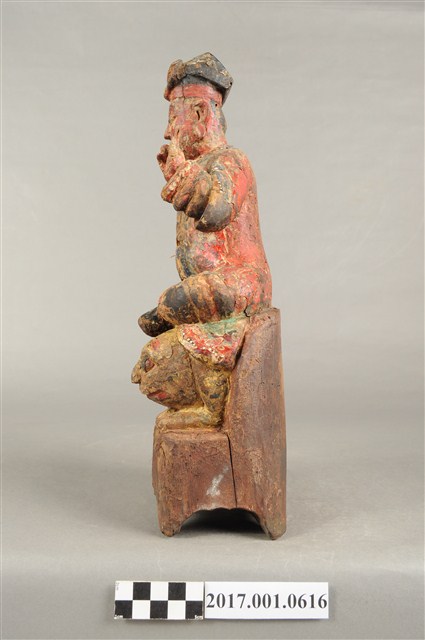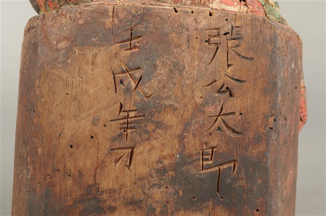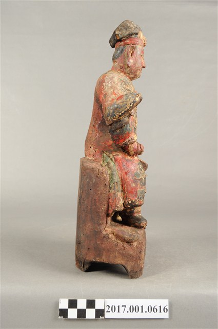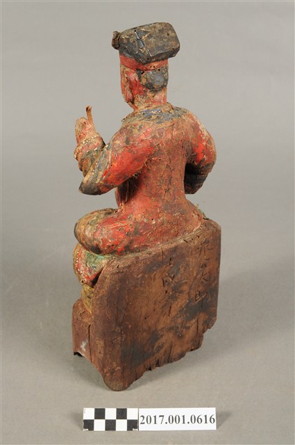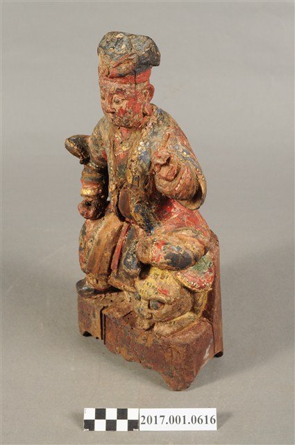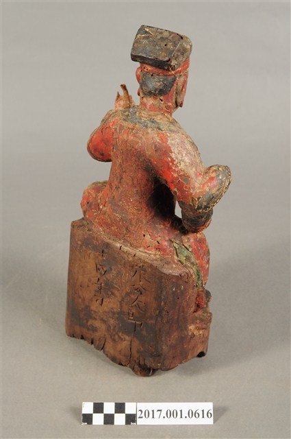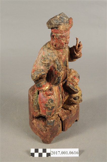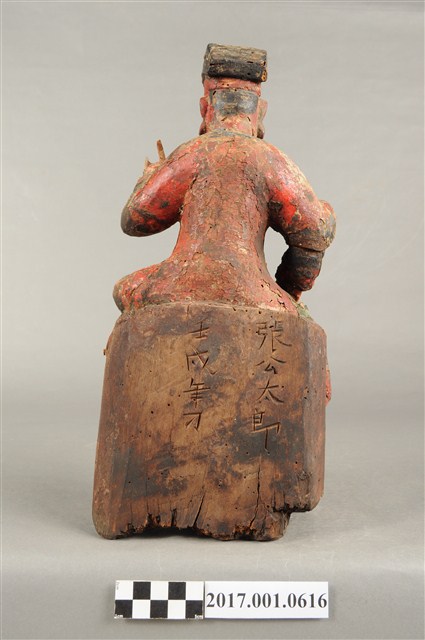 1.本件木雕法師像,作坐姿姿態,坐在虎背上,表面施作塗裝、安金粧佛技法,粧佛局部剝落。顏面表現男性相貌。頭戴巾,身著右衽窄袖長袍,腰繫布帶,長袍外套著對襟法袍,雙腳套履。左腿屈膝內伸,右腿垂下,左手向上捻道指訣,右手握拳持物置於右腿上。虎作趴伏狀。臺座背面有「張公太師 壬戌年開」銘文。