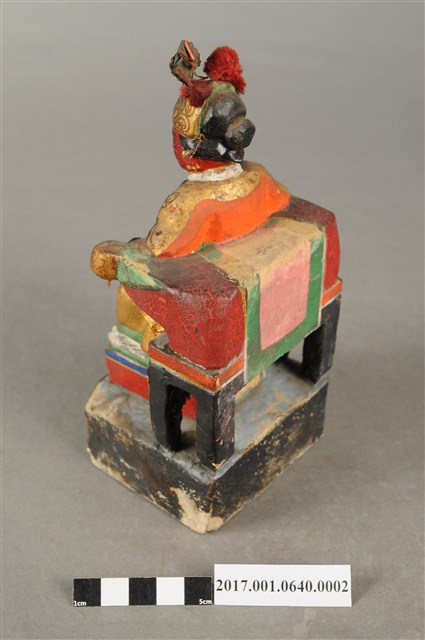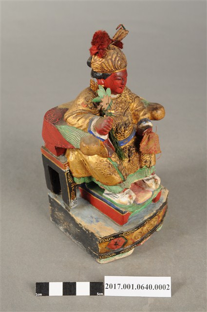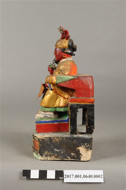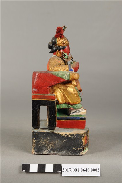 1.本件木雕夫人像採坐姿,端坐於圈背椅上,表面施以漆線安金彩繪工法。夫人臉色絳紅,雙目半睜,雙頰豐腴。頭戴軟巾,盤髮插簪,結紅花,身穿圈領寬袖長袍,長袍漆線盤飾蟒、花卉、雲朵、海浪等紋,雙腳纏足踏踏几。左手持手絹置於左膝上,右手小臂上抬持綠色流蘇之花卉。圈背椅以彩繪裝飾花卉紋,前置踏几,臺座作束腰矮方臺,束腰以漆線盤飾花卉紋,左右兩側有紅色六角形凹槽,上下枋彩繪飾花草紋樣,足部作蓮花狀,彩繪白色花紋,中間作紅色花瓣狀,左右作綠葉狀。