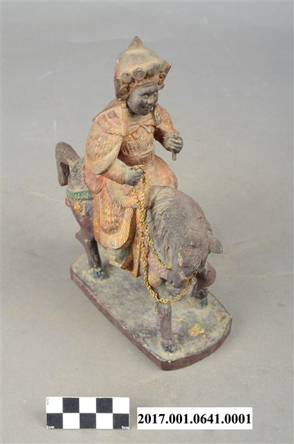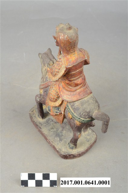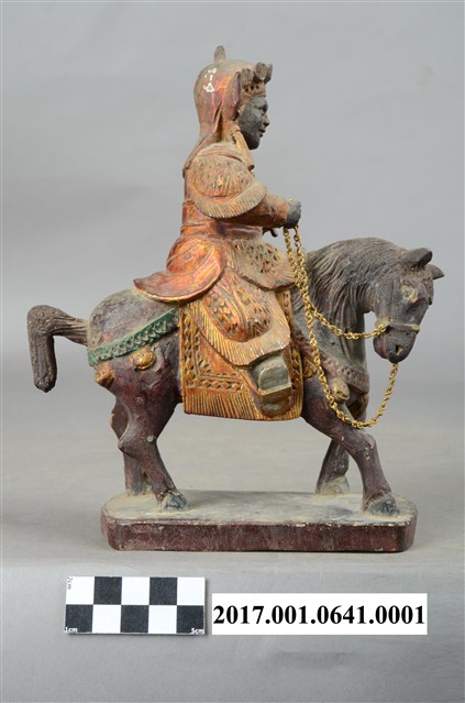 1.本件木雕武將像作帶騎姿態,跨坐於馬上,表面施以錦雕彩繪技法粧佛。武將作年輕男子相貌,臉色黝黑,無鬚,五官粗獷,雙目瞠視,鼻頭顴骨凸起。頭戴兜鏊,冠前飾纓,身穿甲袍,甲袍雕飾鎧甲鱗片,腹部束腰帶,腳穿皂靴,踏馬鐙,左手握拳伸至胸前,右手持韁繩置於胸前。黑馬掛有馬鞍,頭束疆繩,韁繩作金色金屬鍊條,披掛攀胸杏葉,四肢粗壯,左前足屈膝提起馬蹄,其餘四足踏地,低頭轉向右側。臺座作方矮臺。