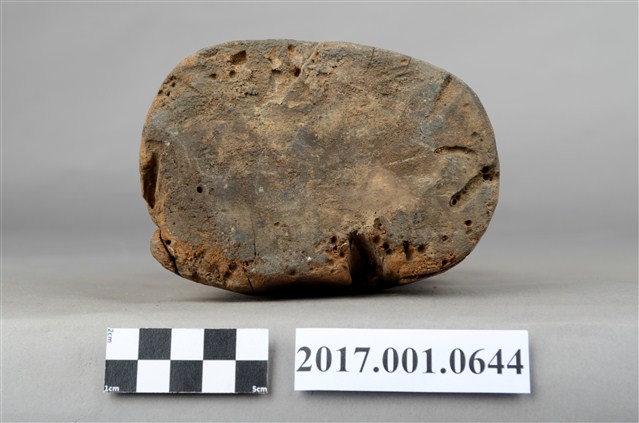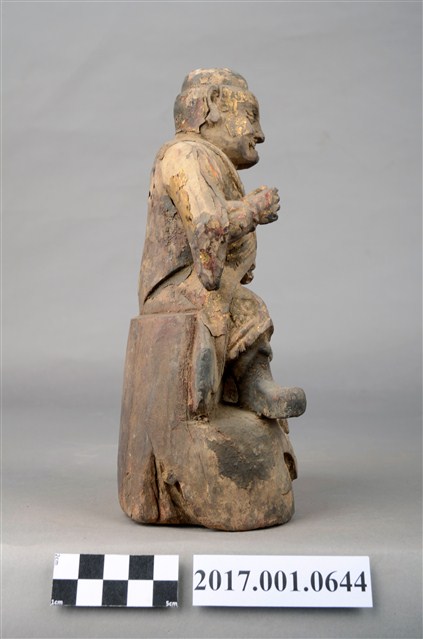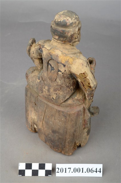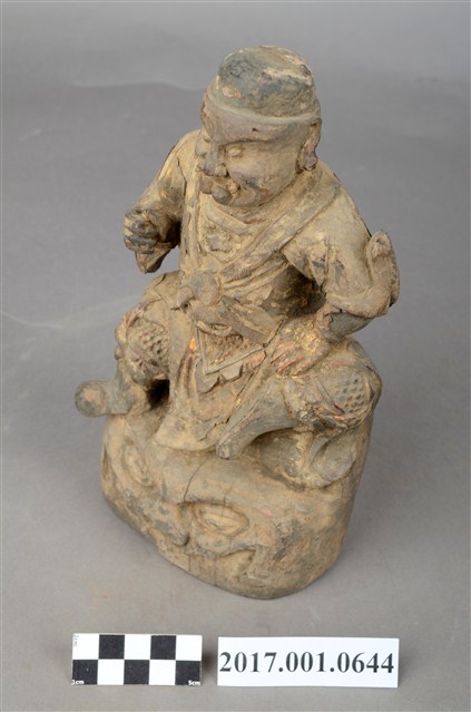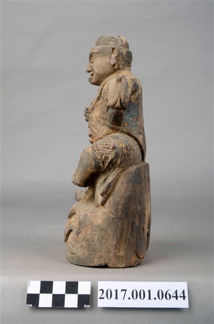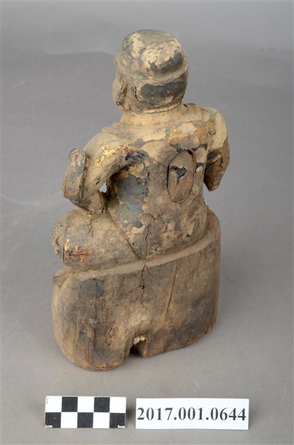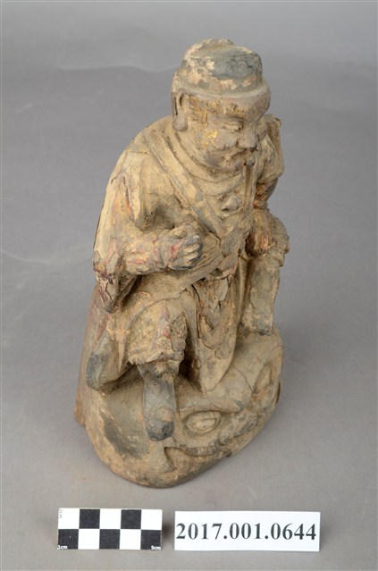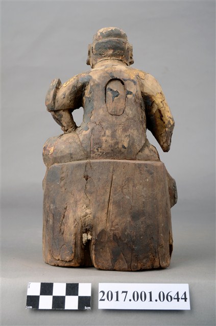 1.本件木雕武將像採坐姿,表面以錦雕安金飾成,安金層剝落,背後開有橢圓形入神洞,封榫尚存。武將挑眉,雙眼圓睜,嘴部下唇作如意頭開裂狀,兩側露出獠牙,表情猙獰。頭部頂端向內縮減一圈,作為加戴帽冠處,帽冠佚失。內穿甲袍,外罩對襟衫,雙腿露出鎧甲兩擋,胸口與腹部有吞口雕飾,腳穿皂靴。左手握拳插腰,右手小臂上舉握拳,左腳抬起倚靠椅凳,右腳伸出踏地,臺座作高圓臺,前方雕飾獅吞造形。