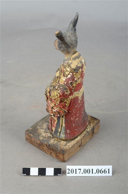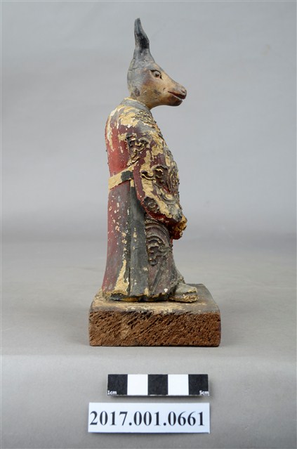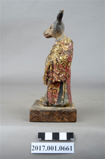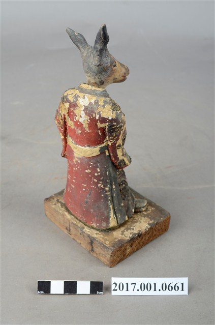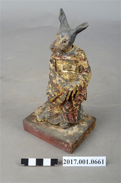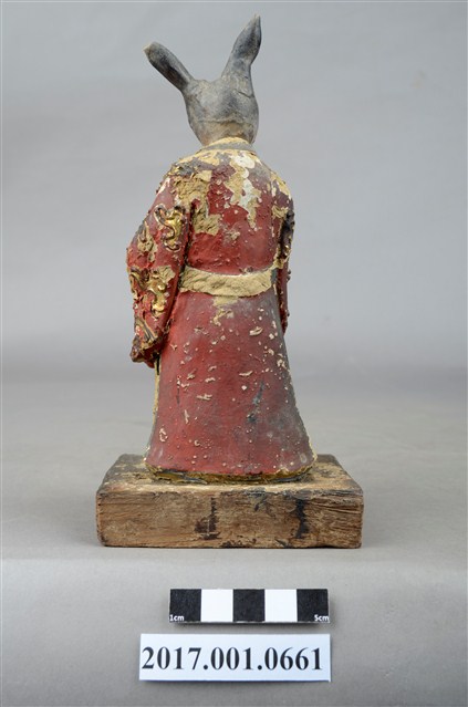 1.本件泥塑兔兒爺像,採立姿姿態,表面施作塗裝、安金不見紅粉線盤飾粧佛技法,局部粧佛剝落,神像為泥塑、臺座為木製。兔兒爺作獸首人身,兔首微側向右,身穿盤領衣,肚腹圓凸頂著腰帶,腳穿皂靴。立像挺身以雙腳分立的姿態站立,雙手環抱於腹前。
