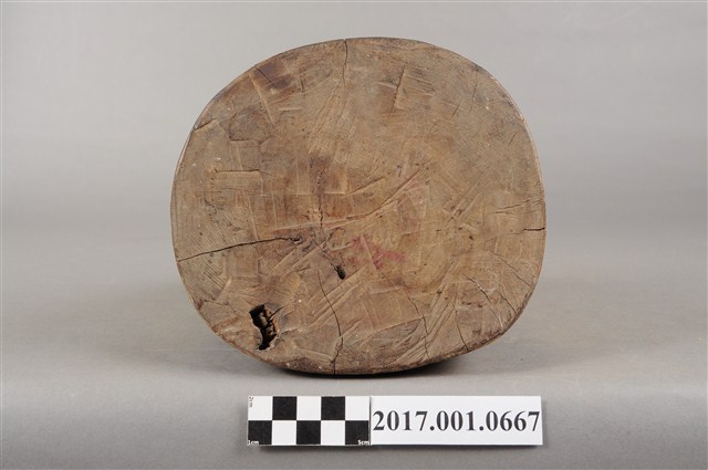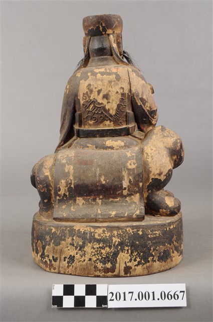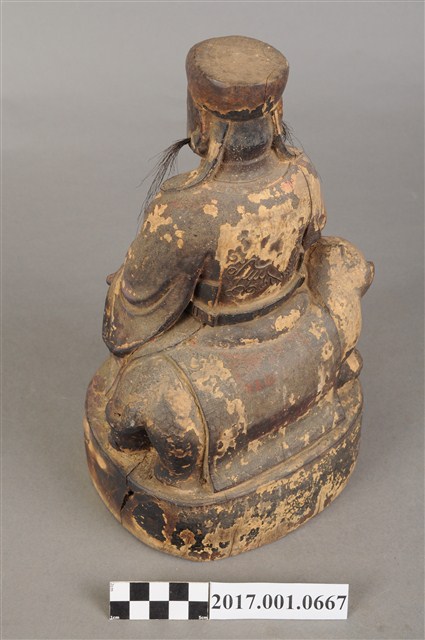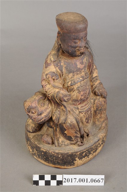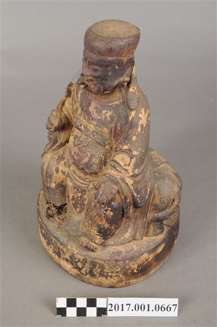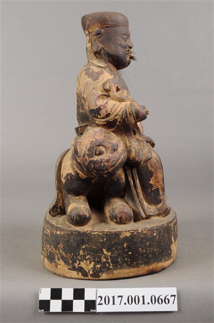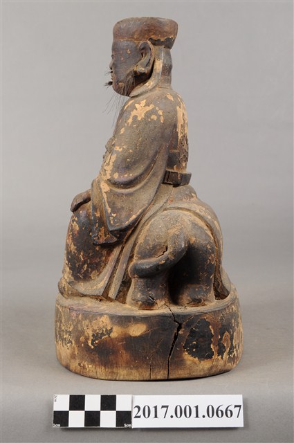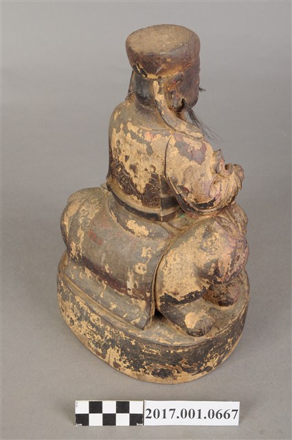 1.本件木雕保生大帝像,作坐虎姿態,表面施作塗裝、安金不見紅粉線盤飾粧佛技法,粧佛剝落嚴重。臉型輪廓方正,雙目半睜,頦肌凸出,鼻翼、下顎、兩頰有植鬚孔,僅存兩頰部分鬍鬚。頭戴圓巾,身著寬袖盤領衣,肚腹圓凸,胸前束看帶,袍服於腹部以粉線盤飾鶴紋。挺身端坐,雙足垂下,左手放於左腿上,右手向上托如意。坐騎為老虎,虎作趴伏狀,虎頭斜視向前,虎背披著坐布。虎下的臺座作圓座,側邊無裝飾。本件判斷為保生大帝,在於所存鬍鬚為黑鬚,顯示作壯年男性形象,而坐於虎背上則呼應醫虎的典故。