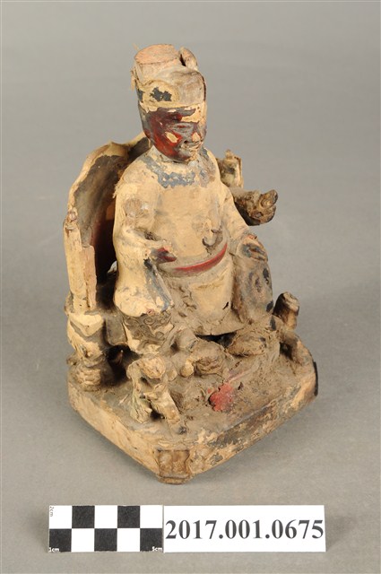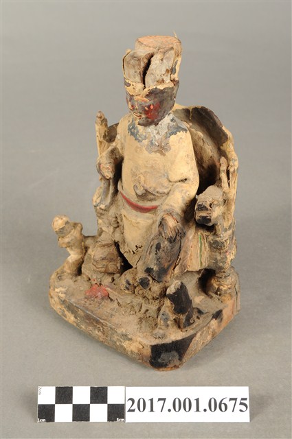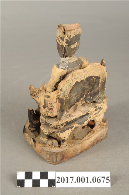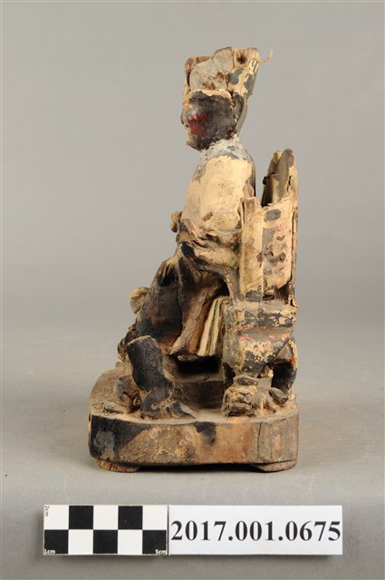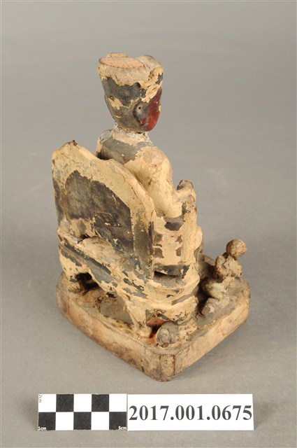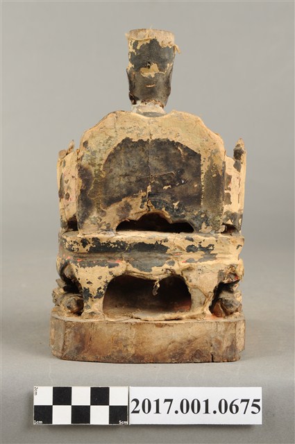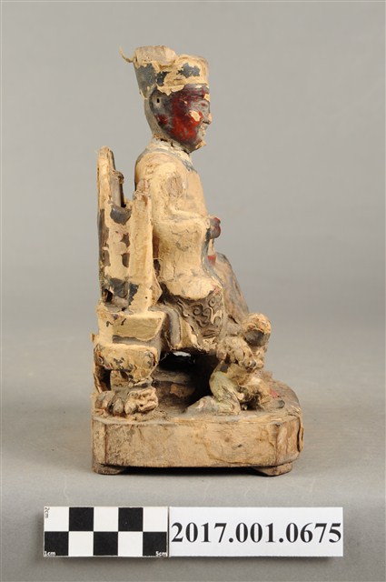 1.本件木雕保生大帝像採坐姿,端坐於圈背椅上,表面粧佛大面積褪去,殘留臉部、腰帶等處顏色,鬍鬚脫落,帽冠前端破損,座椅右側扶手出頭缺損。大帝像作中年男子相貌,臉型修長,鼻下兩側、嘴下各鑽一孔,作為植鬚處。頭戴忠靖冠,身著圓領袍服,腹束腰帶,左手扶於左膝之上,右手小臂前舉,手中持物磨損不明,雙足踏於座前矮臺上之獅背上,右腳之右側一名童子,面朝右前方,作右足跪地雙手合抱於胸前姿態,臺座作方形矮臺,圈背椅後方又有一道圓弧形矮屏。