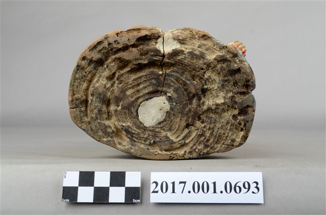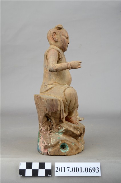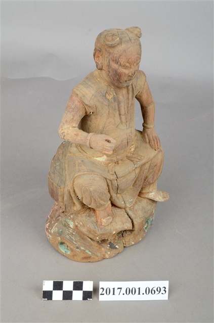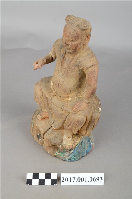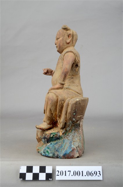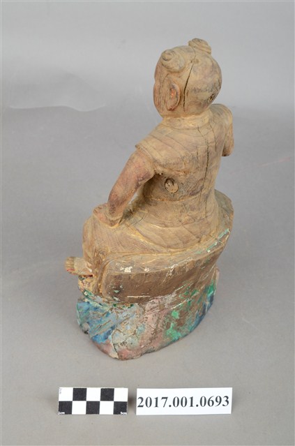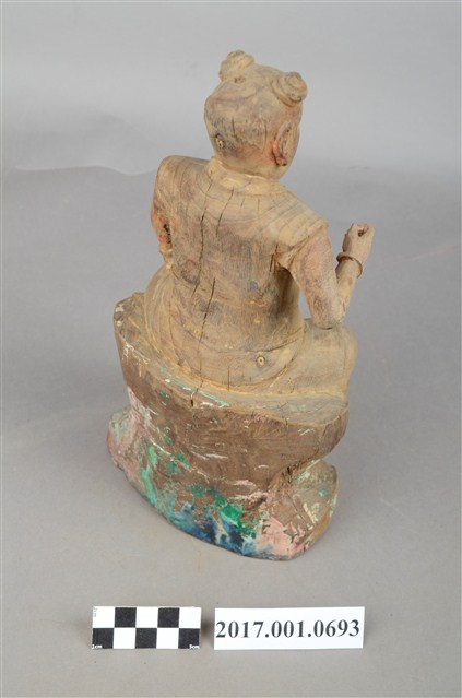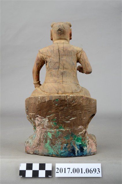 1.本件木雕神農大帝像,作坐姿姿態,表面粧佛已褪去。臉型輪廓豐腴,雙目半睜。頭頂兩端梳髮髻,上半身著無袖罩衫,下半身著裙,腰繫布帶,雙手佩戴手釧,坐於岩座上。挺身端坐,雙足垂下,左腳向斜前方外推、右腳向內,作「文武腳」坐姿,左手掌放於左腿上,右手握拳持物高舉,持物已失。本件判斷為戰後,在於使用心材雕刻。