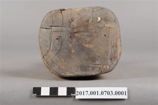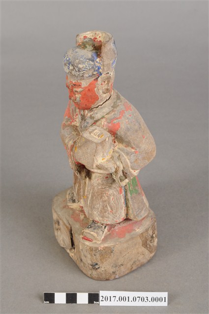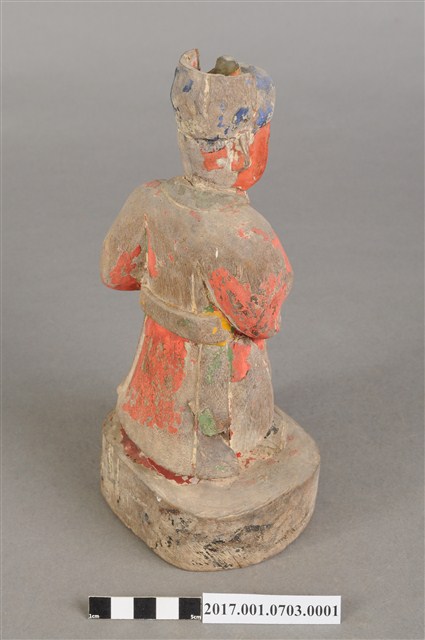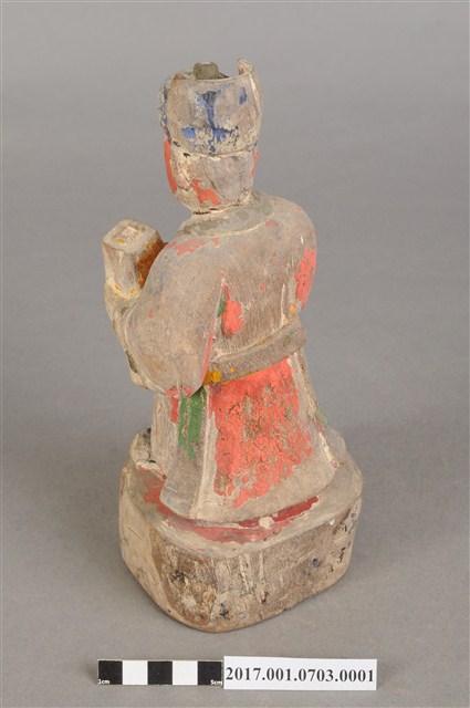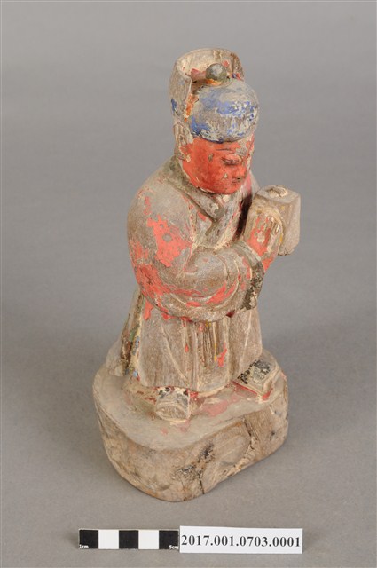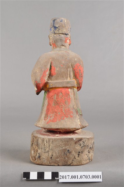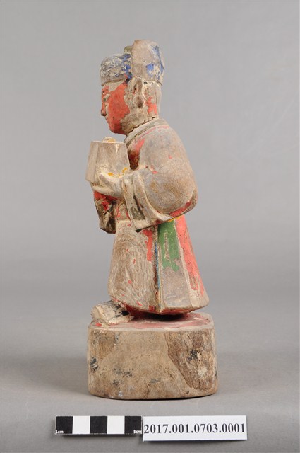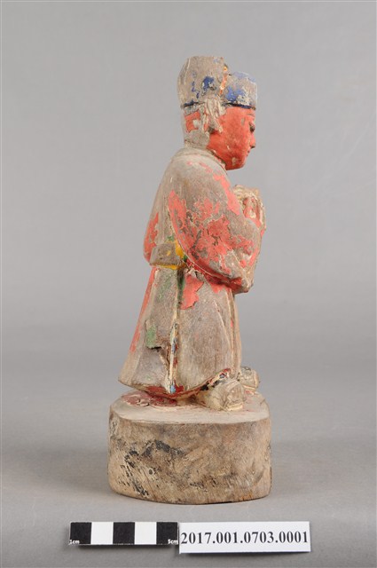 1.本件木雕青年宦官像,作立姿姿態,表面施作塗裝,漆面剝落嚴重。臉型輪廓橢圓,雙目半睁。頭戴三山帽,身著右衽窄袖衫,腰繫布帶,腳穿皂靴。立像挺身以雙足分立的姿態站於臺座上,左手捧著印信方函、右手橫伸向左作護衛狀。臺座作方臺。