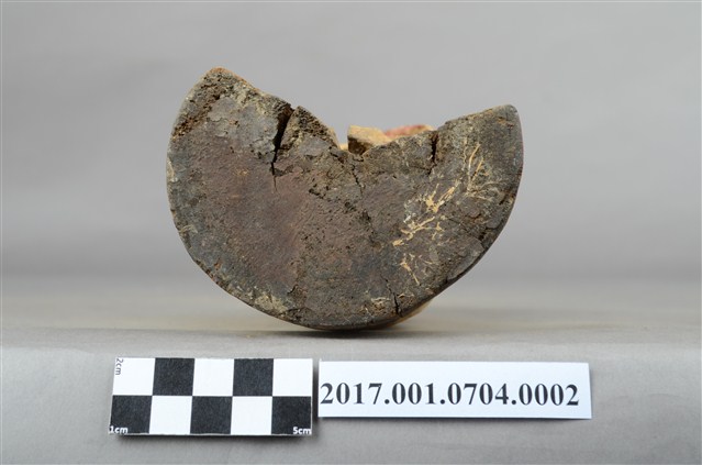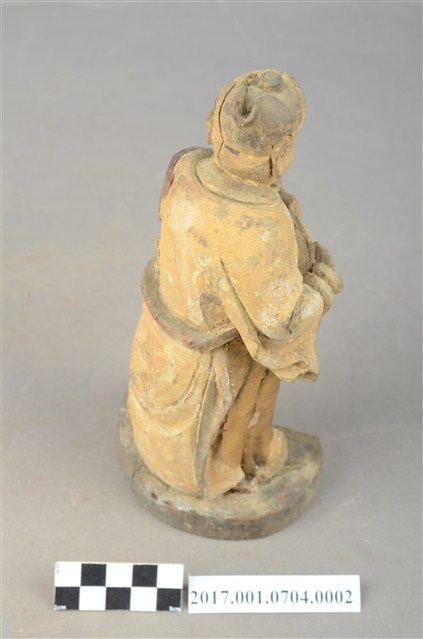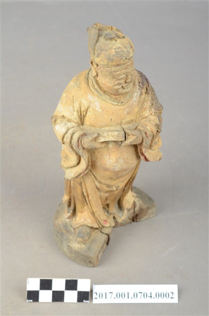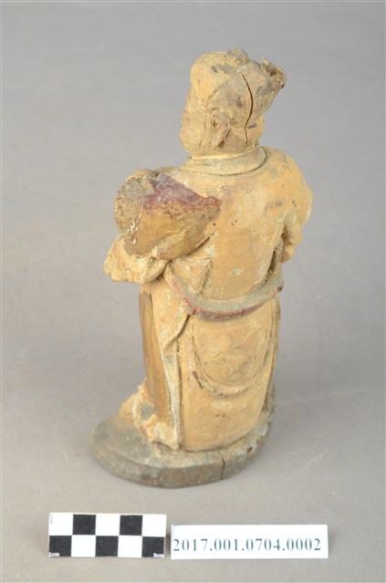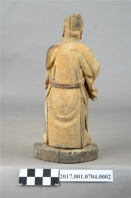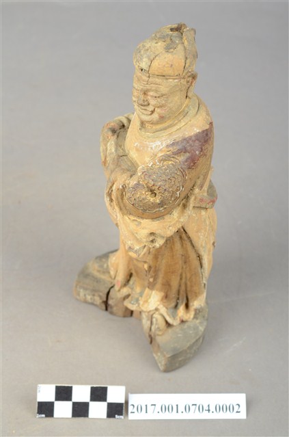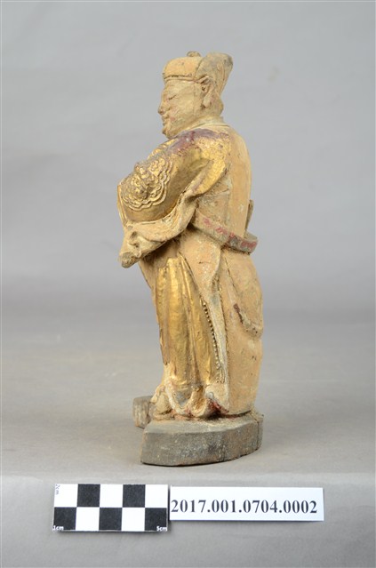 1.本件木雕老年宦官像,作立姿姿態,表面施作塗裝、安金不見紅粉線盤飾粧佛技法,粧佛大多已褪去。頭部微側向左,額頭有抬頭紋,雙目半睁,眼角有魚尾紋,顴骨與頦肌凸出。頭戴三山帽,身著盤領衣,衣袖處還保存粉線盤飾,下半身表現出袍服一層層的衣折紋路,腳穿皂靴,左腳損毀缺損。立像挺身以雙足分立的姿態站於臺座上,右手向上、左手向右上伸,雙手握著腰帶,腰帶上抬。臺座平面呈圓形,臺座局部損毀而無法構成完整的圓。