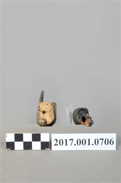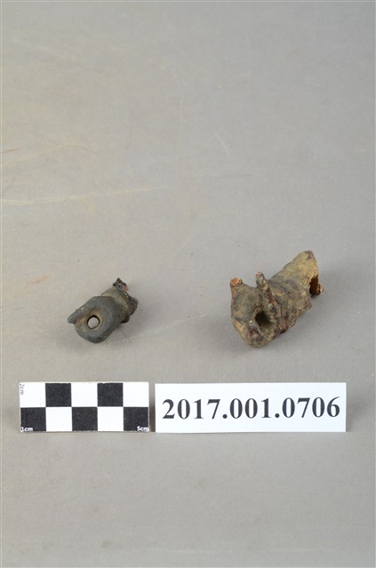 1.本組為木雕神像左右手殘件,表面施作塗裝、安金不見紅粧佛技法,安金剝落嚴重,表面佈滿污漬。
