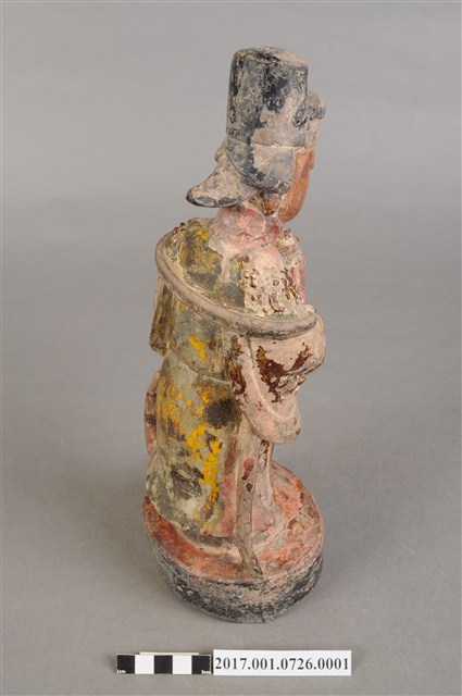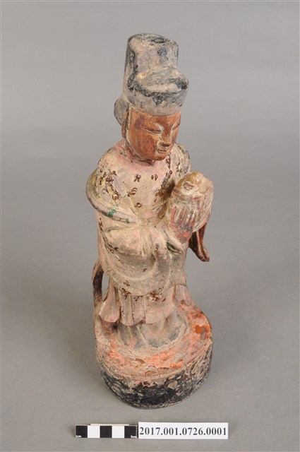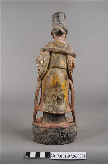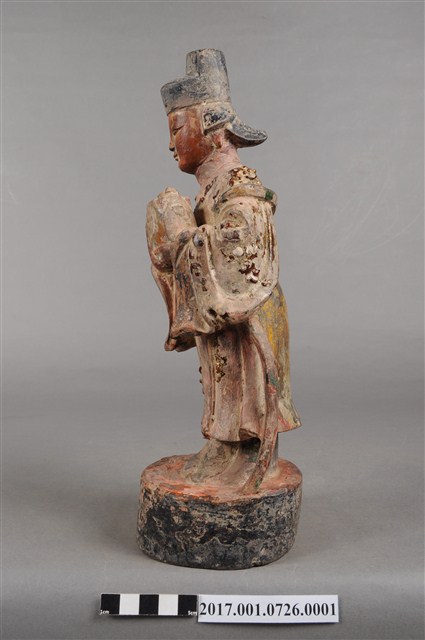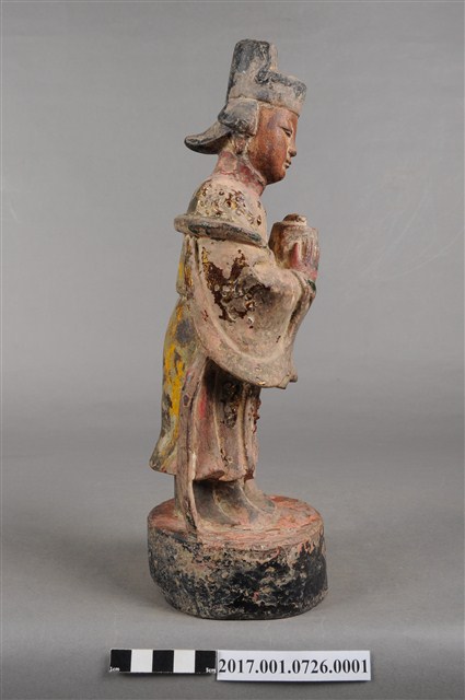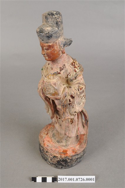 1.本件木雕宮娥像,作立姿姿態,粧佛已褪去。宮娥的臉型輪廓橢圓,頭部微側。頭戴無翅幞頭,身穿寬袖盤領衣,腰繫腰帶,腳穿弓鞋,披飄帶,飄帶垂至臺座。身軀微側,立像挺身以雙足併攏的姿態站於臺座上,左手托印信方函,右手作護衛狀。臺座作圓臺。