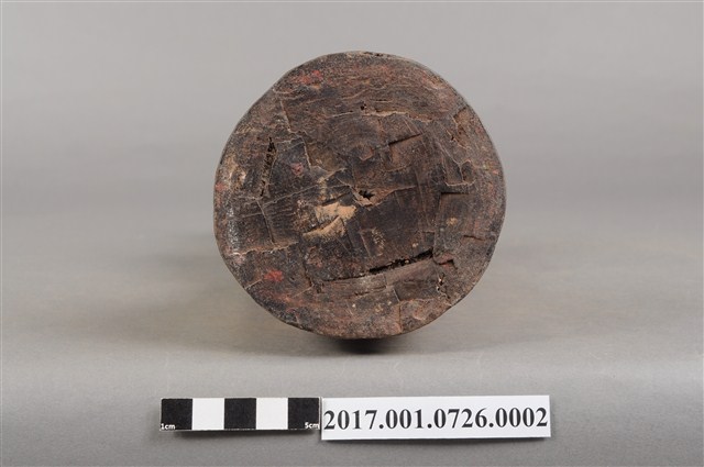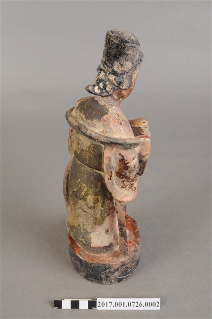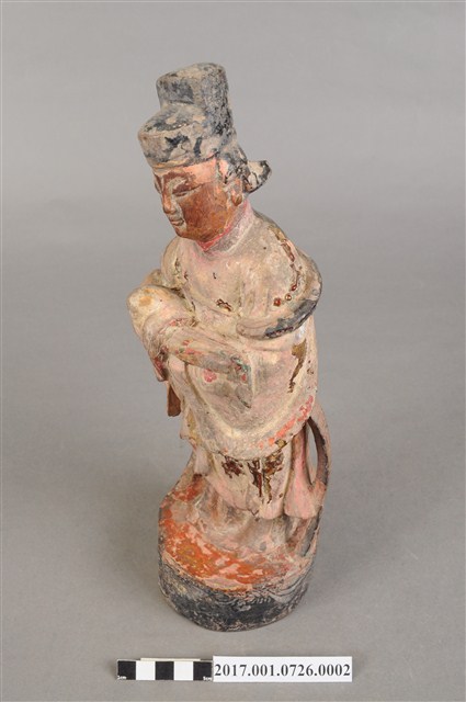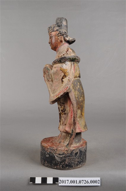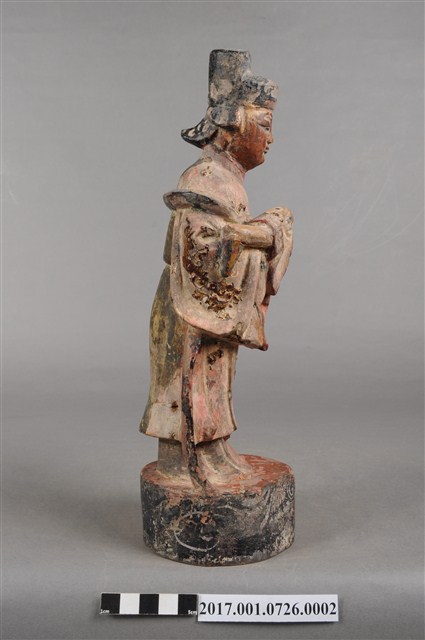 1.本件木雕宮娥像,作立姿姿態,粧佛已褪去。宮娥的臉型輪廓橢圓。頭戴無翅幞頭,頭部微側,身穿寬袖盤領衣,腰繫腰帶,腳穿弓鞋,披飄帶,飄帶垂至臺座。身軀微側,立像挺身以雙足併攏的姿態站於臺座上,雙手於胸前作揖,手掌包覆布巾托珠。臺座作圓臺。