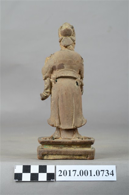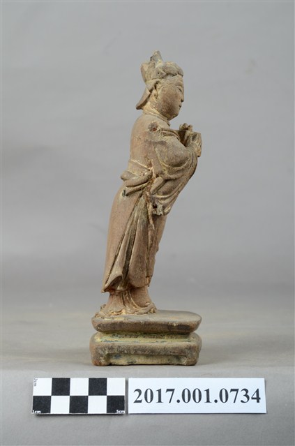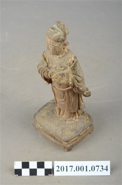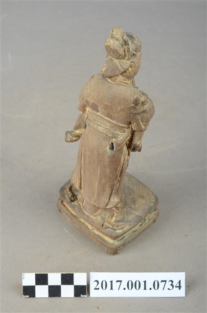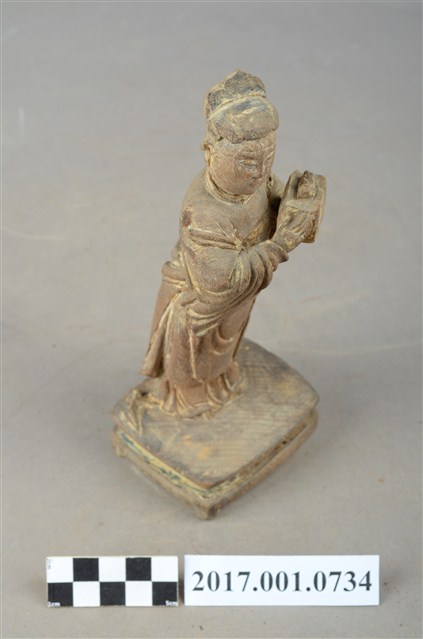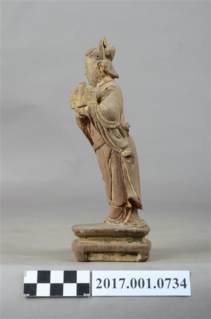 1.本件木雕宮娥,作立姿姿態,粧佛清除。宮娥的臉型輪廓橢圓,頭部微側向右。頭梳髮髻,身穿寬袖盤領衣,腰繫腰帶,腳穿弓鞋。身軀微側,立像挺身以雙足併攏的姿態站於臺座上,左手托印信方函,右手作護衛狀。臺座作案几形式。