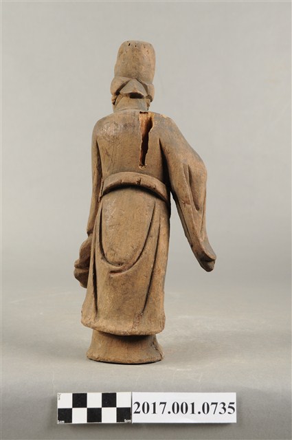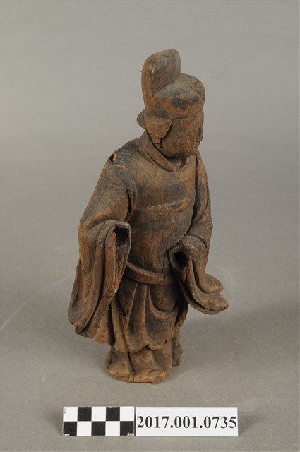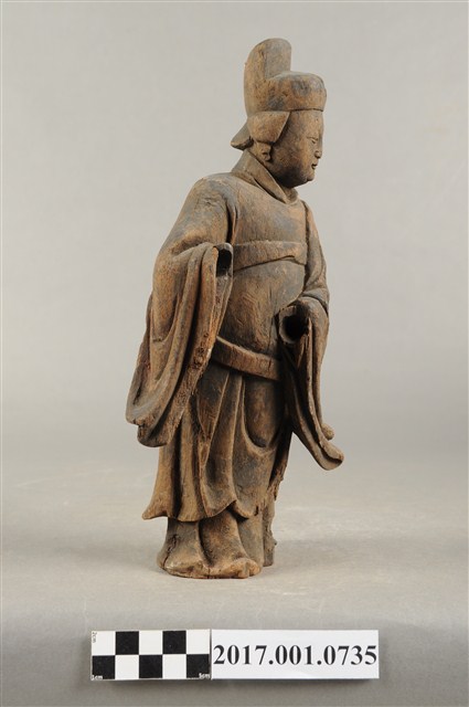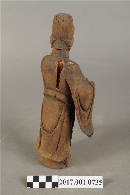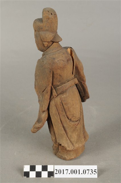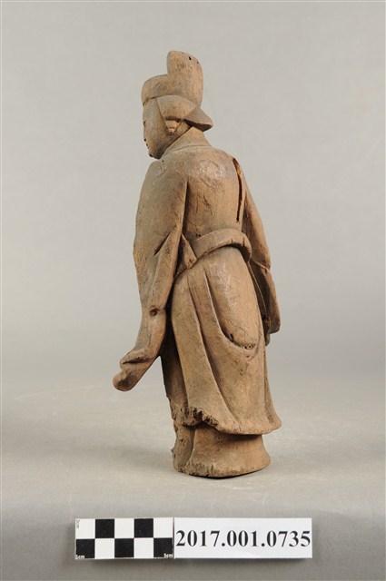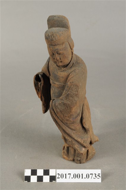 1.本件木雕宮娥,作立姿姿態,粧佛已清除,背部局部損毀。宮娥的臉型輪廓橢圓,頭部轉頭向左。頭戴無翅幞頭,身穿寬袖盤領衣,腰繫腰帶,腳穿弓鞋。身軀微側,立像挺身以雙足並立的姿態站於臺座上,左手橫伸向右,右手向前,雙手的手掌脫落遺失。