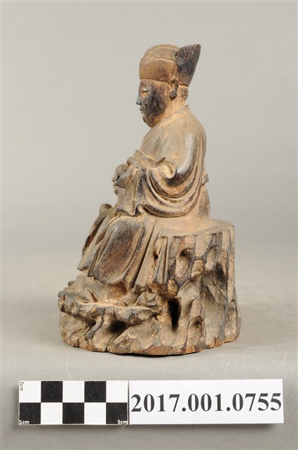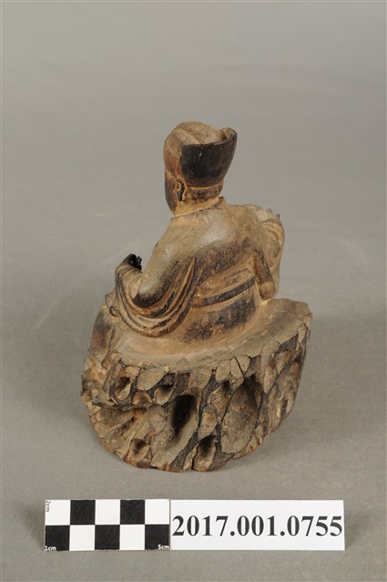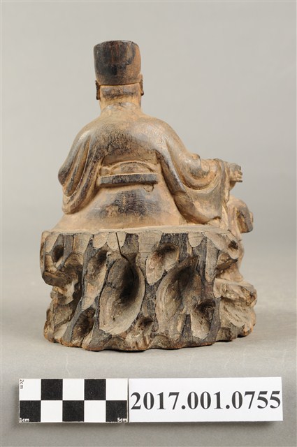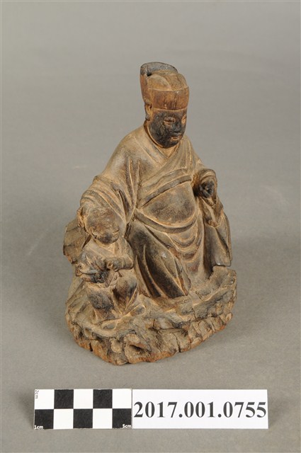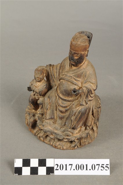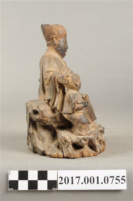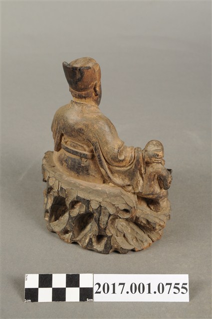 1.本件木雕張仙大帝像,作坐姿姿態,坐於岩座上,表面粧佛已褪去。臉型輪廓橢圓,雙眼半睜。頭戴忠靖冠,身著右衽寬袖衣,肚腹圓凸,腹下束腰帶,胸前有看帶。挺身端坐,雙足垂下,左手翻掌向上作托物狀,右手向右摸身旁童子的頭部。童子髮梳髻。頭部斜視向左,臉型輪廓圓潤,身著窄袖罩衫,腳穿長褲,右手托如意,左手作護衛狀。