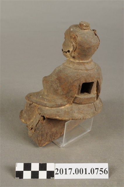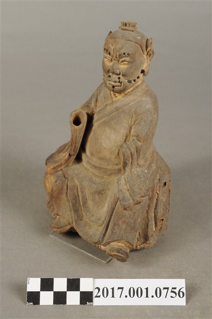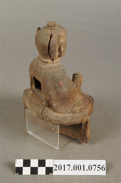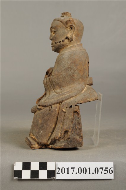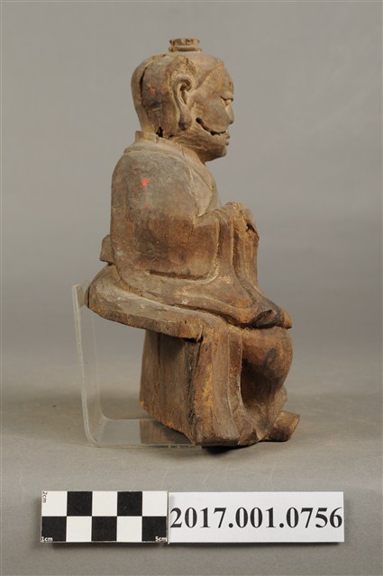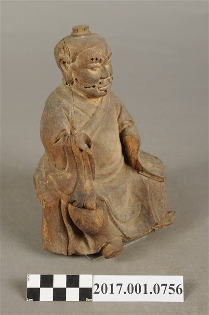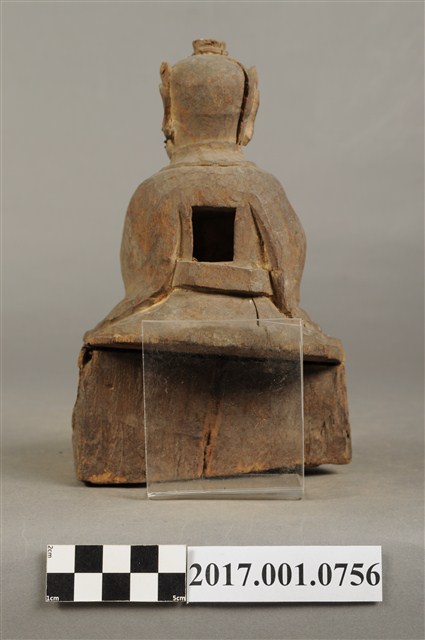 1.本件木雕張天師像,採坐姿姿態,粧佛已清除,背面開有方形入神洞,封榫佚失,內容物件已取出,神像背面有縱向裂痕。皺眉,顴骨與頦肌凸出,顏面在眉骨、鼻翼兩側、下顎、兩頰有植鬚孔,鬍鬚已脫落遺失。頭戴芙蓉冠,身著右衽長袍。挺身端坐,左腳垂下,右腳向內縮,左手掌削除,右手舉起,右手掌遺失。本件屬於「脫椅」作法,臺座已遺失。