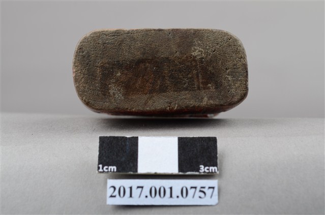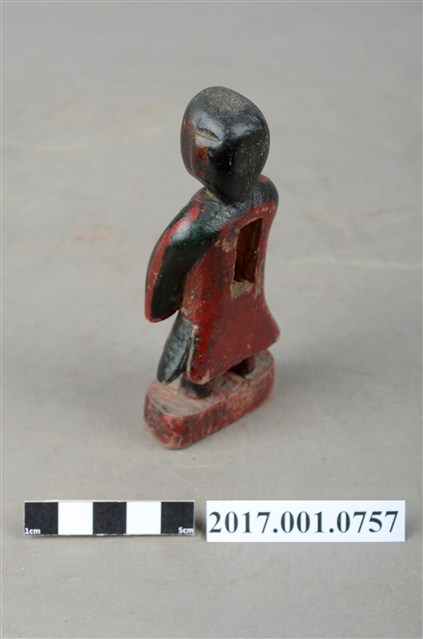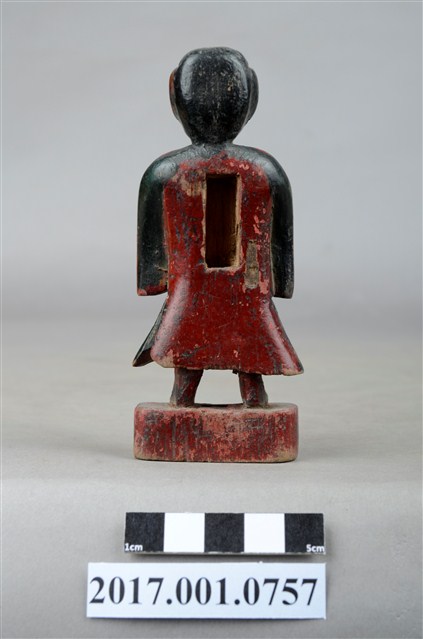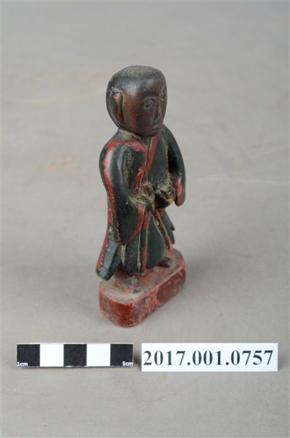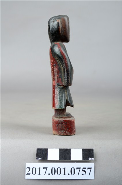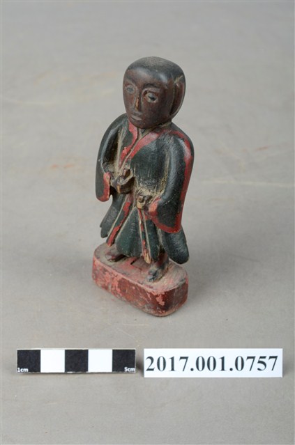 1.本件木雕張五郎,作立姿姿態,表面施作塗裝,背部開有長方形入神洞,封榫佚失,內容物件已取出。頭形輪廓圓形,身著窄袖衫,穿皂靴。立像挺身以雙腳分立的姿態站於臺座上,雙手持物置於腹前。本件判斷為張五郎,在於梅山文化圈常以葡萄藤作為雕刻張五郎神像的材料首選,神像雕刻會受限於材料,也因此張五郎的神像有時會表現得極為簡易,雖然並未所有張五郎像皆是以葡萄藤作為材料,但雕刻表現會仿葡萄藤神像的作法。