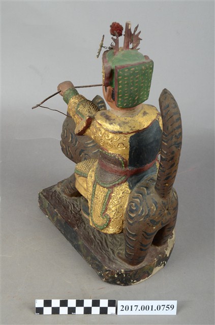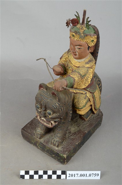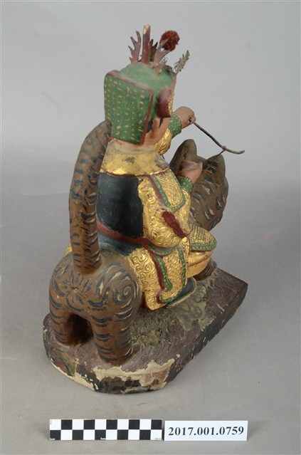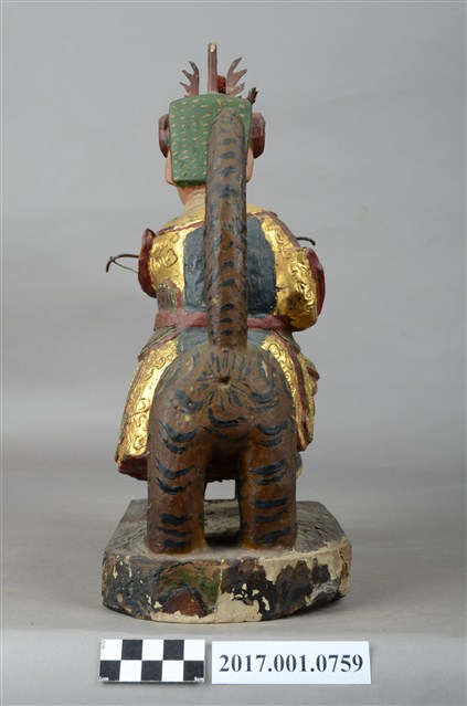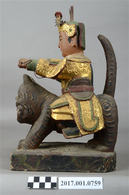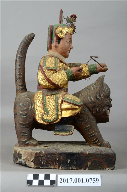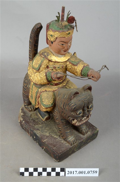 2.黃飛虎為封神演義中的人物,因妻子遭到紂王侮辱逼死,憤而投效周武王,最終在討伐朝歌城時陣亡,死後被封為五嶽之首泰山東嶽大帝,本件黃飛虎像作武將騎虎拉弓貌,與鎮風之瓦將軍造型雷同,瓦將軍有黃飛虎、蚩尤等說法。(富俐崴文化事業有限公司/謝宗榮計畫主持)