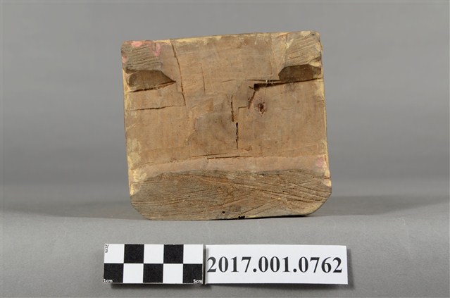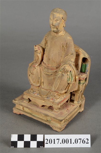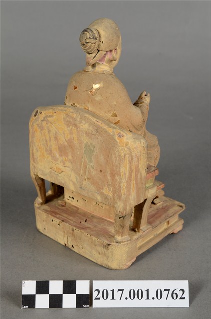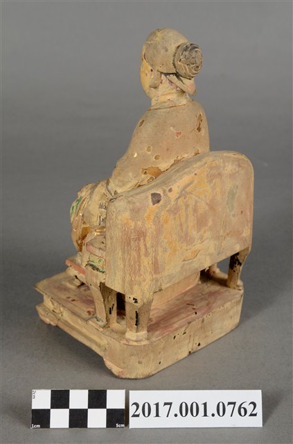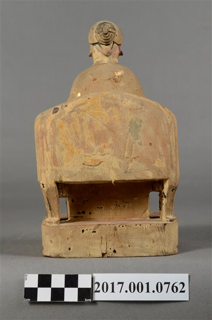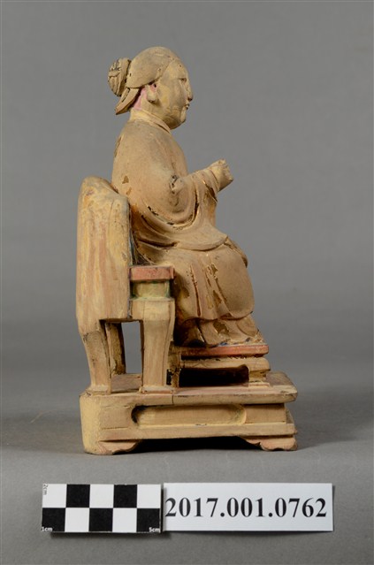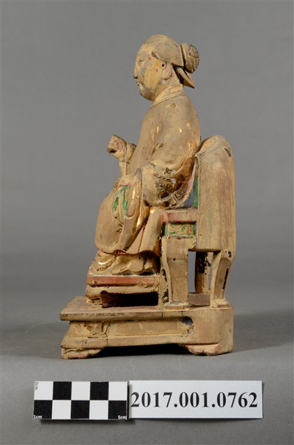 1.本件木雕註生娘娘像,作坐姿姿態,表面粧佛已清除。頭無戴冠,髮梳髻盤於腦後,顏面雙目半睜,身著盤領衣,腰部繫束腰,腳穿弓鞋,坐於圈背椅上。端坐,左手放掌置於左膝、右手高舉呈握物狀。圈背椅兩側扶手的出頭已缺失,出頭推測是表現龍頭,圈背椅前有踏几。本件臺座平面呈方形,雕塑為案几形式。