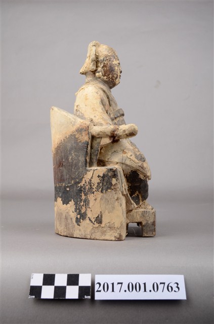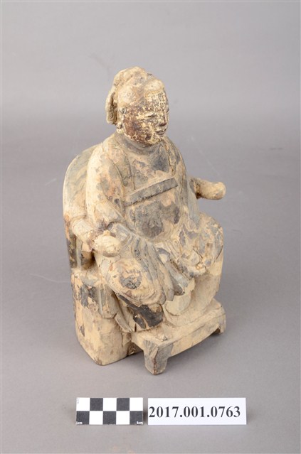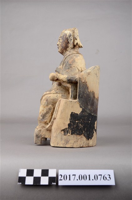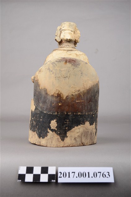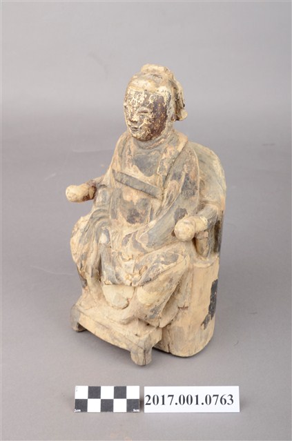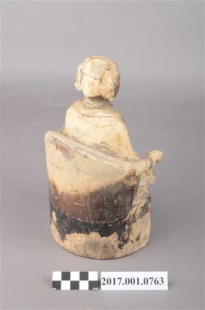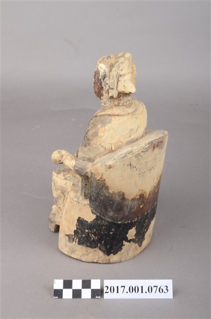 1.本件木雕註生娘娘像,表面粧佛已褪去。頭戴額子,髮梳髻盤於腦後,顏面雙眼垂視,胸圍看帶、腰繫腰帶,雙腳套弓鞋,坐於圈背椅上。端坐,兩手環抱於腹前的通壽體,通壽體又稱抱袖體。圈背椅前有踏几。