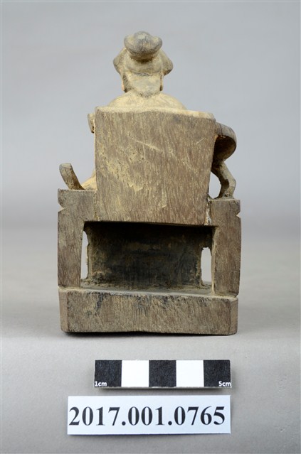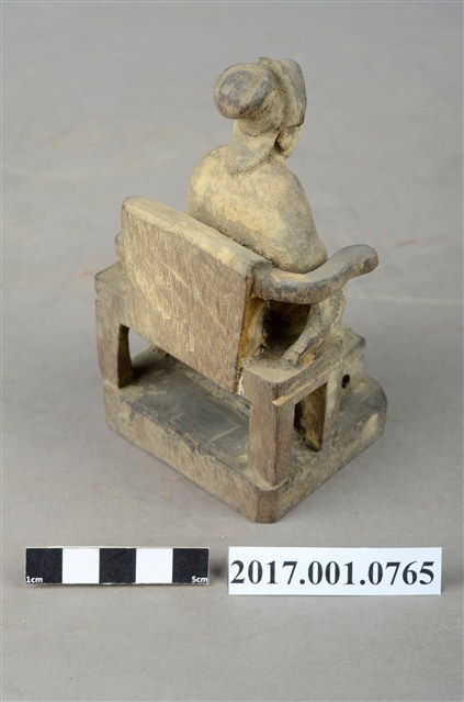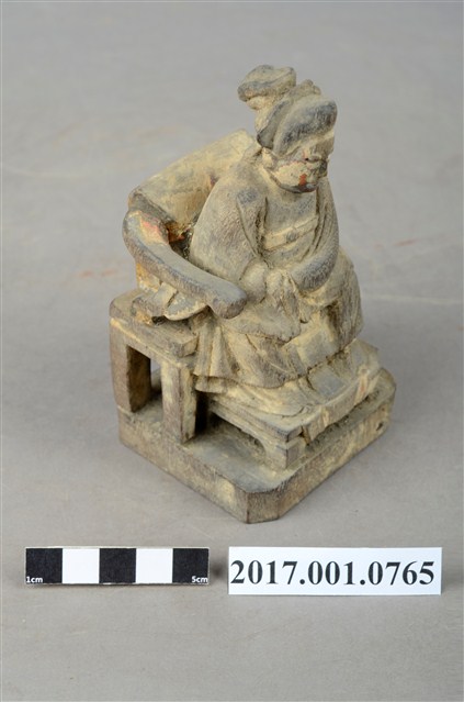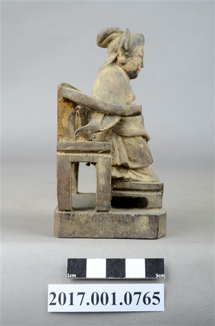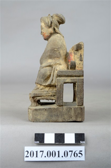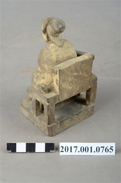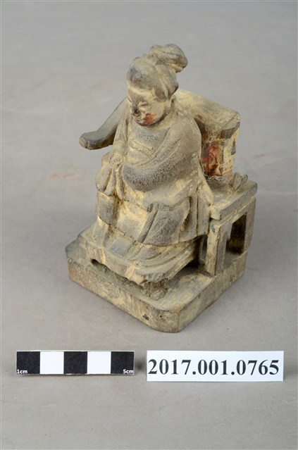 1.本件木雕註生娘娘像,粧佛已褪去。頭戴額子,髮梳髻盤於腦後,顏面雙目半睜,身著盤領衣,胸圍看帶,雙腳套弓鞋,坐於圈背椅上。端坐,兩手環抱於腹前的通壽體,通壽體又稱抱袖體。圈背椅左側扶手已缺失,圈背椅前有踏几,椅下有臺座。