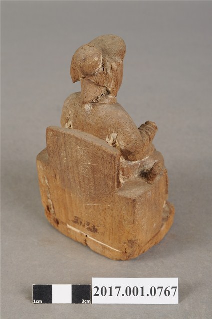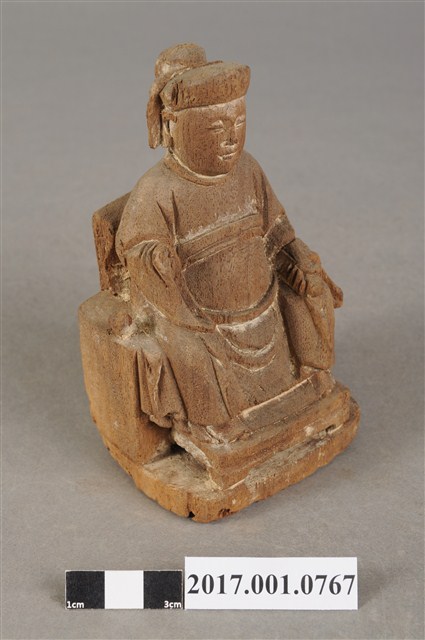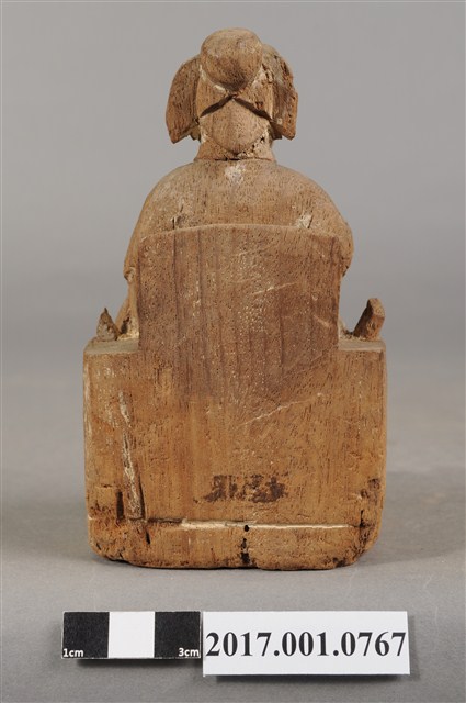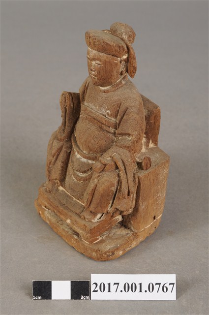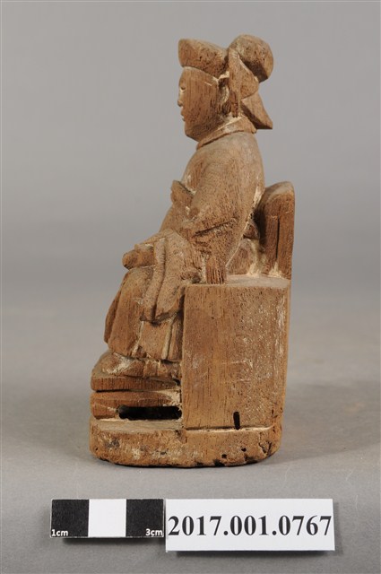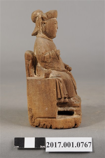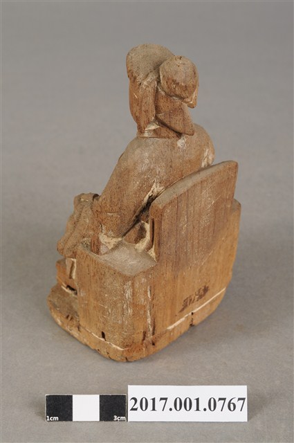 1.本件木雕註生娘娘像,作坐姿姿態,坐於圈背椅上,粧佛已褪去。髮梳髻盤於腦後,顏面雙目半睜,身著盤領衣,腹圍看帶、腰繫腰帶,雙腳套弓鞋。端坐,左手握書卷置於左膝,右手舉起,右手掌已缺失。圈背椅兩側扶手已缺失,圈背椅前有踏几,椅下為臺座。
