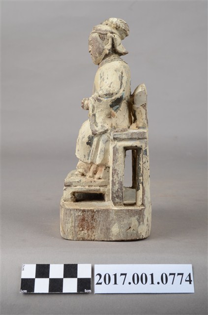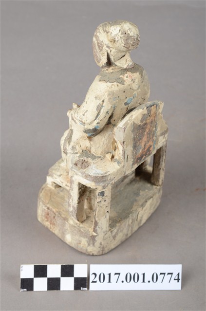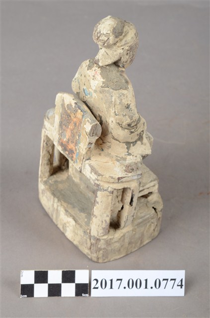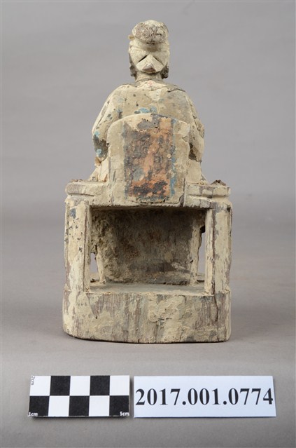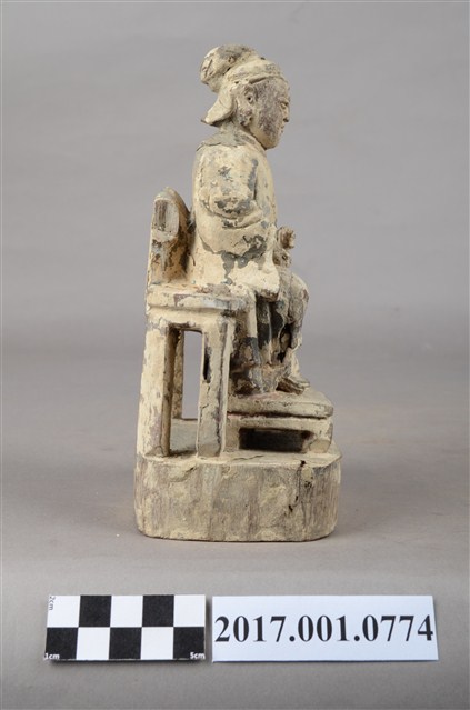 1.本件木雕註生娘娘像採坐姿,表面粧佛已除去,露出底層裱土層。註生娘娘坐於圈背椅上,椅下鏤空,兩邊扶手缺損,椅下另有一大型的方形臺座。註生娘娘端坐,臉型呈鵝蛋臉,臉孔娟秀,頭梳圓髻,身穿圓領袍服、長裙。右手手肘微彎,手掌上仰虛握,安放於右腿上,左手手肘微彎,小臂向前平舉,手掌缺損。雙足自然下垂,腳著弓鞋,雙足踩於一張小型方形踏几。