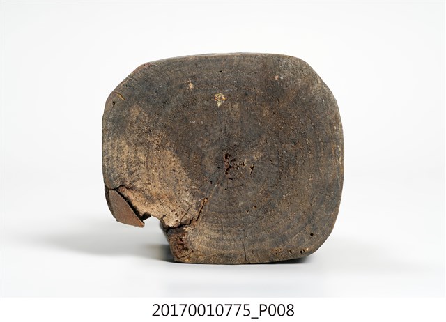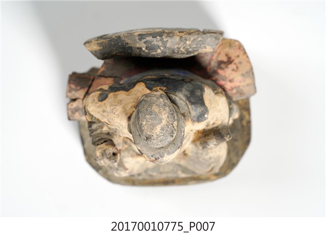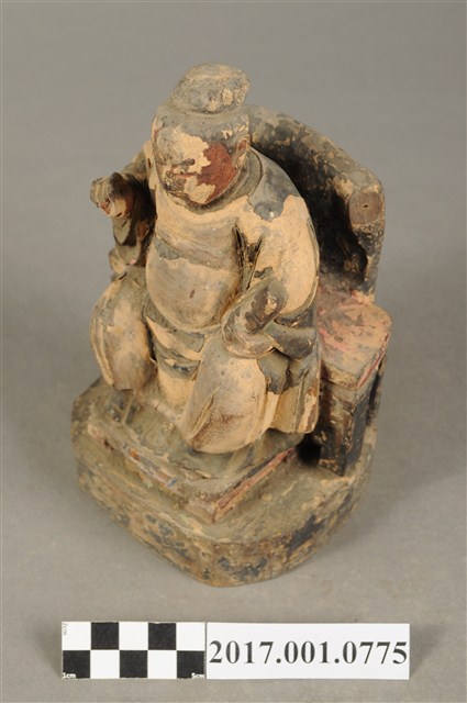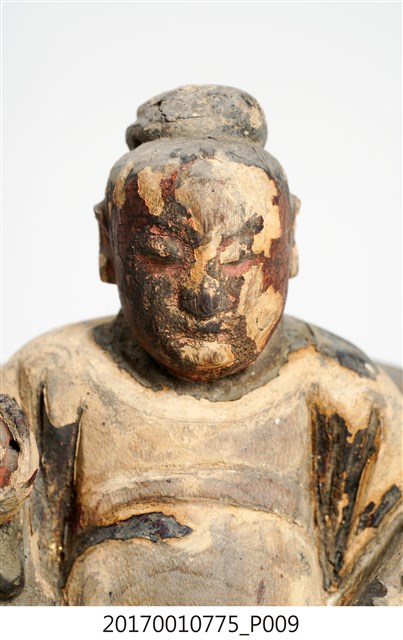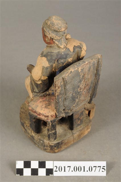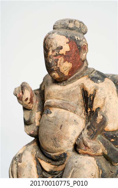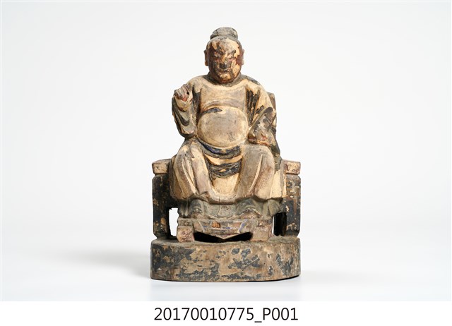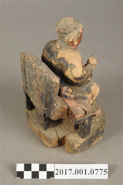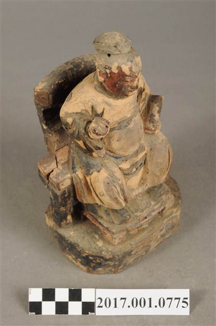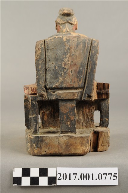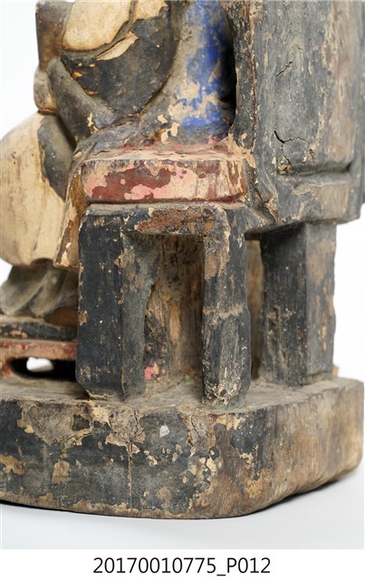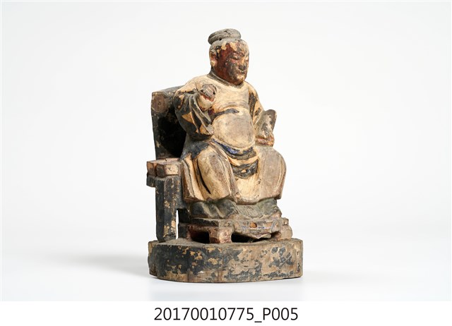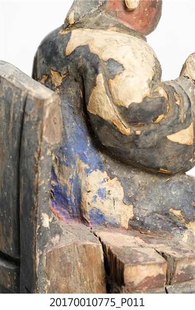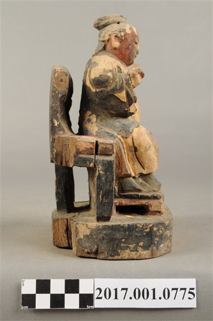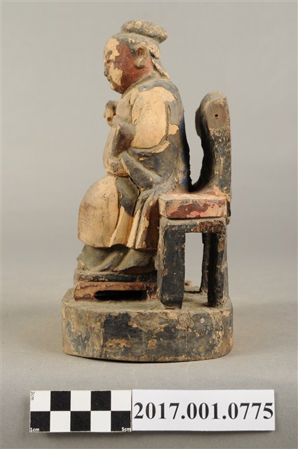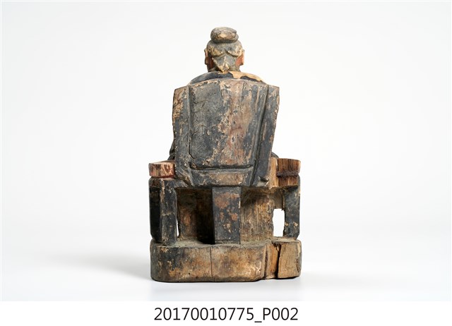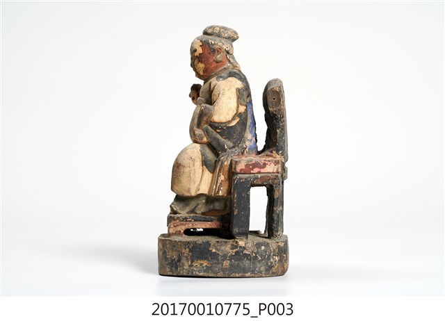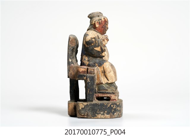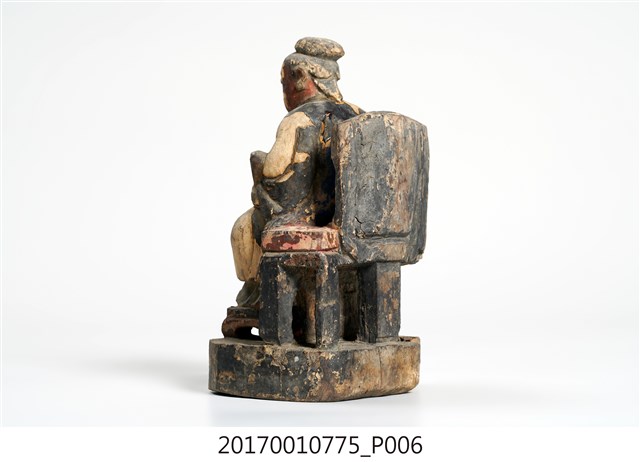 1.本件木雕註生娘娘像,作坐姿姿態,坐於圈背椅上,表面施作塗裝粧佛技法,局部漆面剝落。髮梳髻盤於腦後,雙目半睜,身著盤領衣,腹圍看帶、腰繫腰帶,雙腳套弓鞋。端坐,左手握書卷置於左膝,右手舉起。圈背椅兩側扶手已缺失,圈背椅前有踏几,椅前有踏几,臺座作方臺。