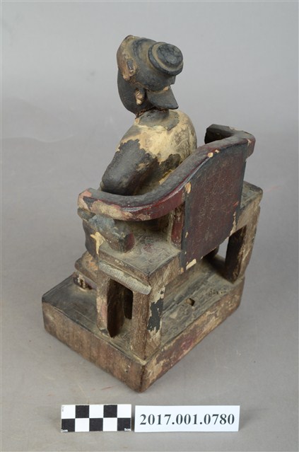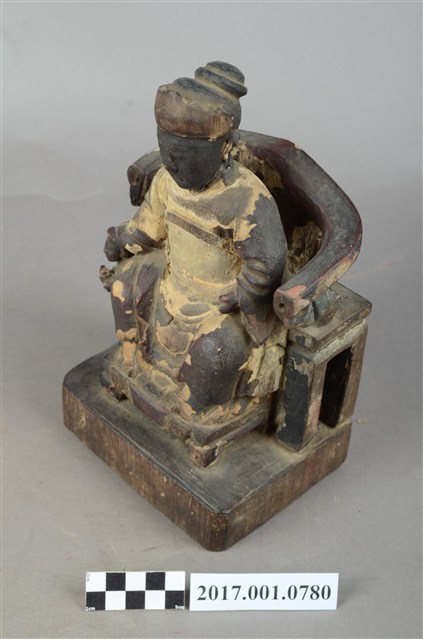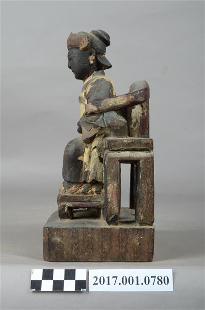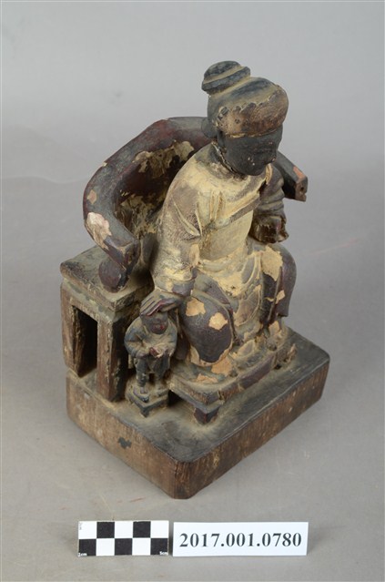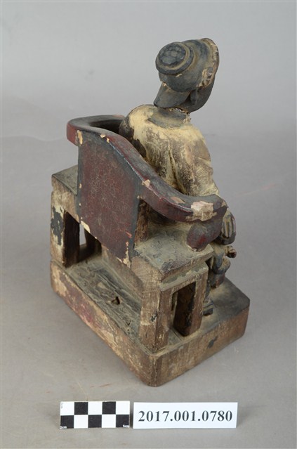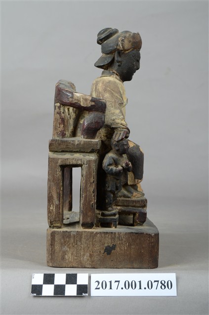 1.本件木雕註生娘娘像,作坐姿姿態,坐於圈背椅上,表面施作塗裝粧佛技法,局部漆面剝落。髮梳高髻,頭戴額子,顏面雙目半睜,身著盤領衣,腹圍看帶、腰繫腰帶,雙腳套弓鞋。端坐,左手掌置於左腿上,右手放掌摸著幼童的頭。本件註生娘娘的右側有一幼童,立姿挺身站在踏几之上,上半身穿右衽窄袖衫、下半身著長褲、腰繫布帶,雙手於胸前交叉捧物,物件推測是元寶。圈背椅扶手的出頭已缺失,推測出頭是表現龍頭,圈背椅前有踏几,椅下為臺座,臺座無雕刻與裝飾。