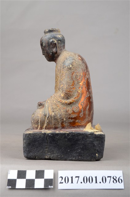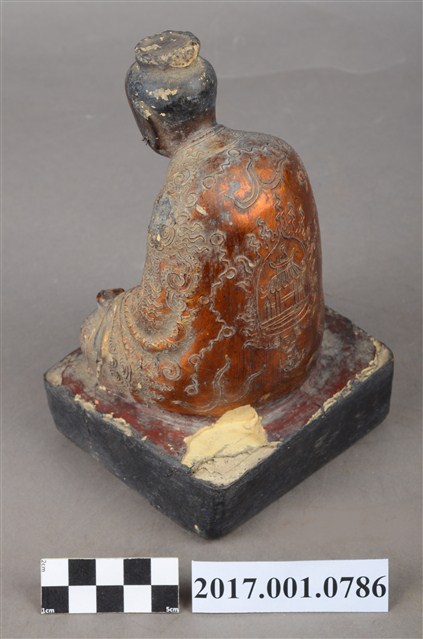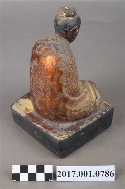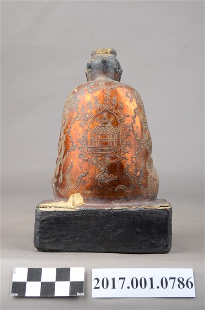 1.本件木雕吳公真仙像,採坐姿姿態,作道士修行扮相,表面施作塗裝、安金不見紅漆線盤飾粧佛技法,顏面、臺座薰黑。面部為中年男子相貌,臉形橢圓,顏面在鼻翼兩側、下顎、兩頰有植鬚孔,鬍鬚已脫落遺失。身軀前傾,頭戴芙蓉冠,內著右衽長袍,外罩罡衣、蔽膝,袍服佈滿漆線盤飾,罡衣衣襟盤飾捲草紋、八卦之卦象,正面及蔽膝盤飾鶴紋、雲紋,背面盤飾玉樓霄臺。挺身盤坐,雙手握拳分置於雙腿上,左手掌心朝上,右手掌心朝下,寓有陰陽太極之意。臺座呈方形,漆面局部剝落。此做法為先入神,後粧佛,故表面看不出內有入神。