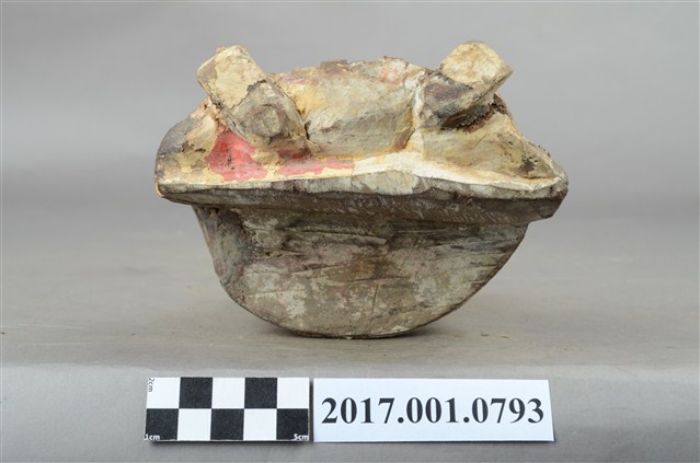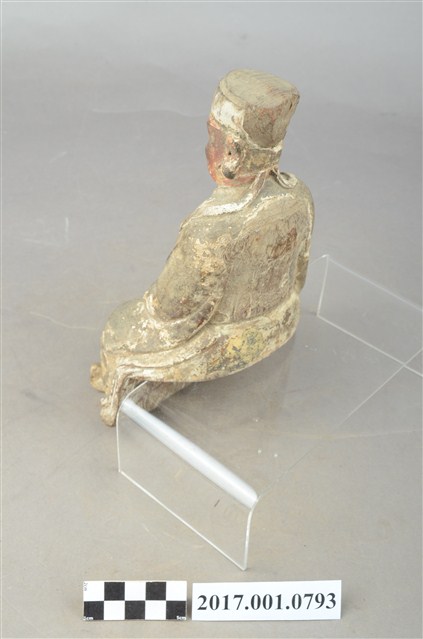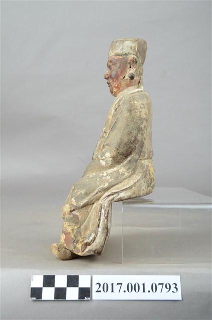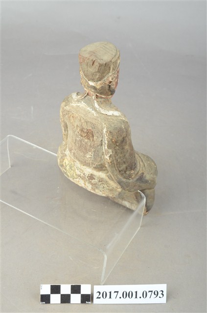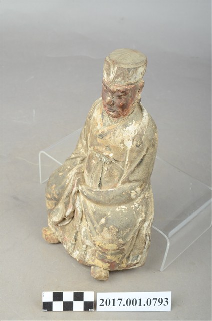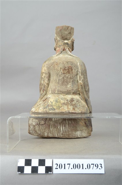 1.本件木雕道教居士像採坐姿,座椅已失,表面斑駁脫落,鬍鬚脫落。居士作中年男子相貌,臉型修長,雙眼垂視,鼻下兩側及嘴下鑽有小孔作為植鬚處,頭戴東坡巾,巾後方帽帶垂於兩肩,身著斜襟寬袖袍服,腹上束有腰帶,在胸前作蝴蝶結,腰帶頭之帶穗垂於下襬中央。雙手下垂交握於腹前,以右手握左袖,是為抱袖(壽)體,兩手掌隱於袖內,雙足張開平均踏於地面。