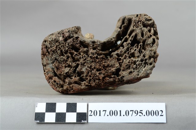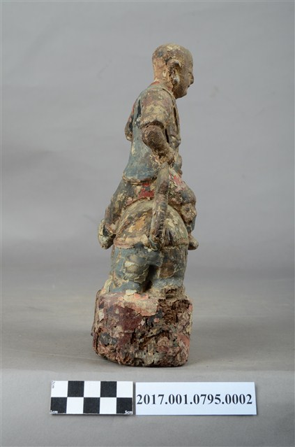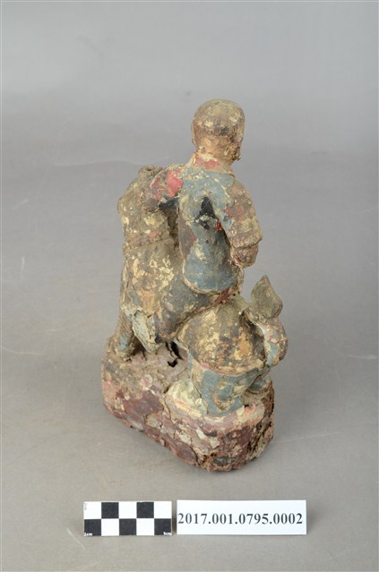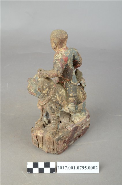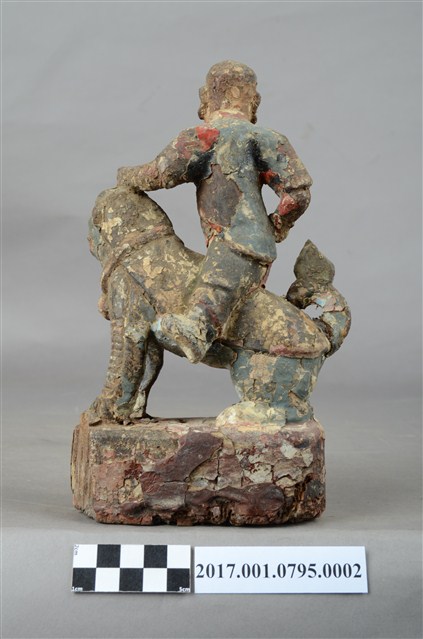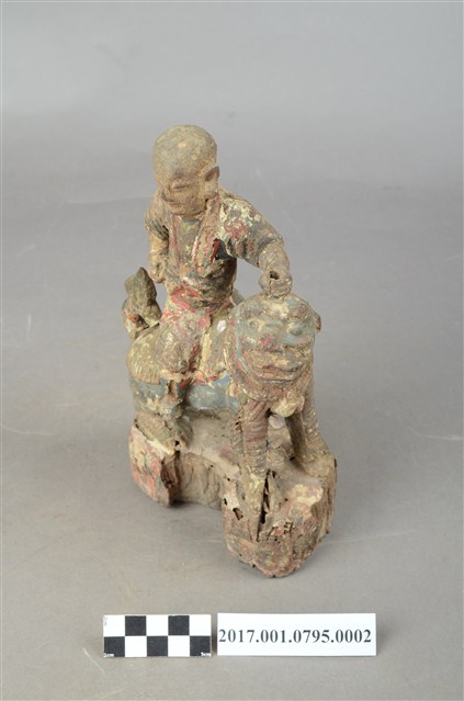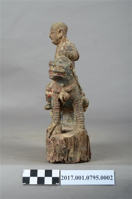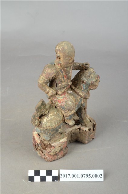 1.本件為木雕騎獅童子像組之二,尺寸略大於另一件,兩件作對稱姿態,表面粧佛大面積褪去,臺座底部蛀蝕。童子作少年相貌,短髮,長耳垂,跨坐於一隻蹲坐的獅子背上,雙手握拳,左手小臂往左伸出,右臂手肘略彎,手部置於腰部旁,上身轉向朝前方。身著紅色衣褲,外罩黑色開襟短衫,跨下獅子作前肢直立、後肢蹲坐姿勢,頭部在右側略轉向,張口裂嘴,頸部掛有項飾,身體作灰黑色,背上披綵作淺灰色。臺座前方刨挖成半圓形洞,有蛀蝕現象。