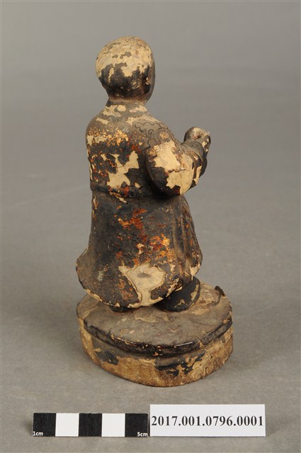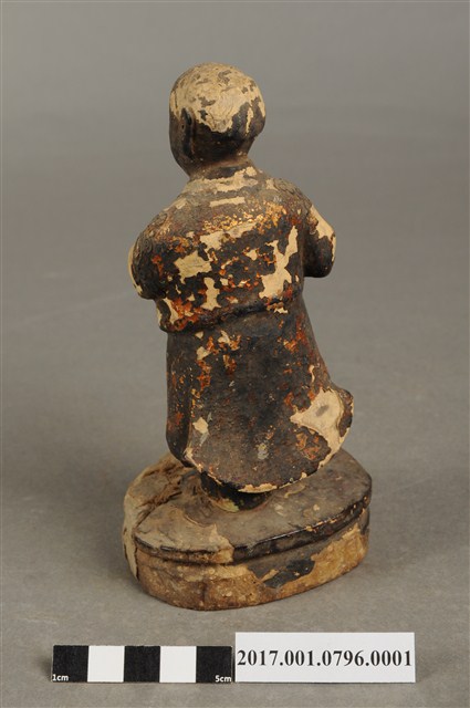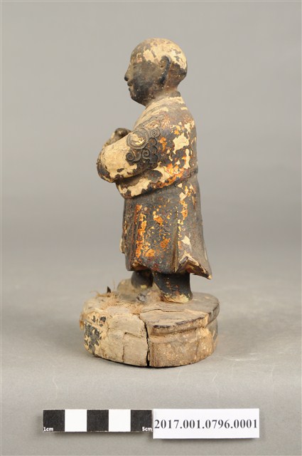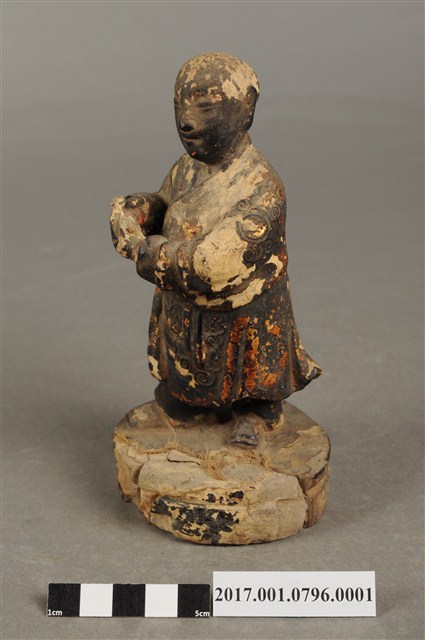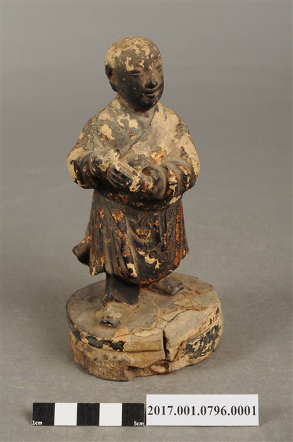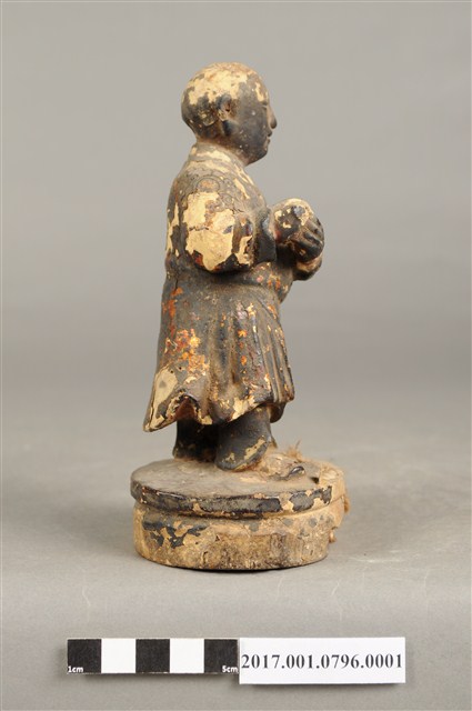 1.本件木雕童子像,作立姿姿態,表面施作塗裝、安金不見紅粉線盤飾粧佛技法,粧佛局部剝落,臺座的粧佛剝落處可見地仗層作法,臺座並貼一張圓形紅紙,為民俗信仰為了避免退神的神像遭受神靈附著所貼。顏面表現幼童相貌,嘴微開,身著右衽窄袖長袍,腰繫布帶,腿著長褲,腳穿履。立像挺身以雙足丁字步的姿態站於臺座上,左手右伸,右手屈肘,雙掌相疊於右胸前,手掌上無持物。臺座於座前下方雕刻成案几。