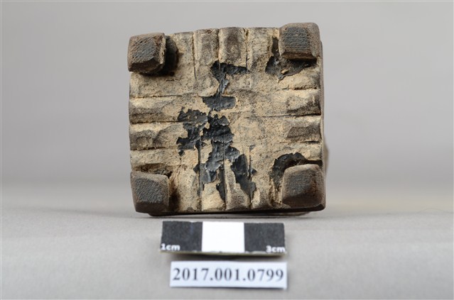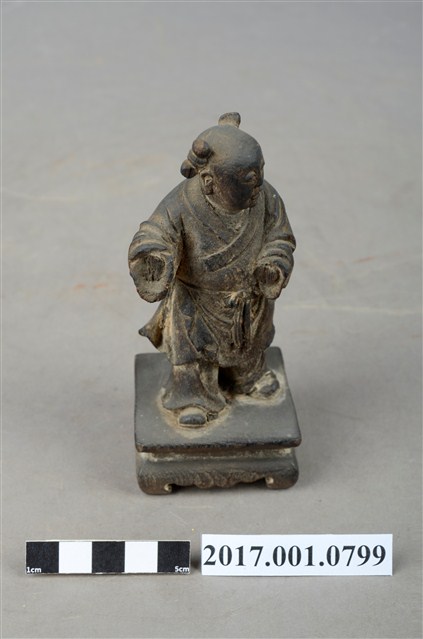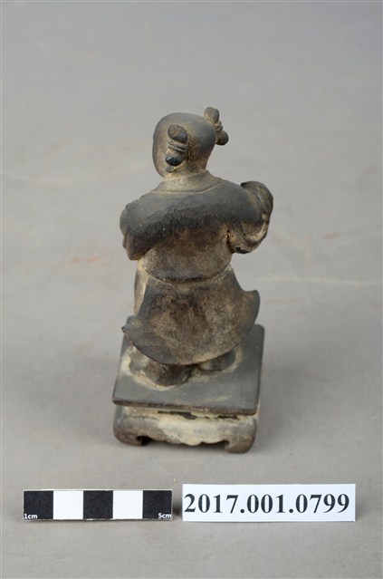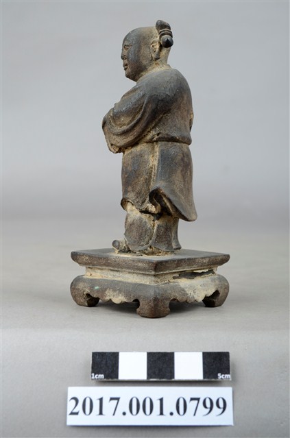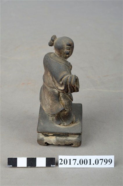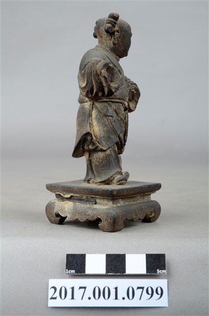 1.本件木雕童子像,作立姿姿態,表面施作塗裝粧佛技法,漆面局部剝落。頭部轉向左。頭梳雙髻,顏面表現童子相貌,身著右衽窄袖衫,腰繫布帶,雙足著長褲,雙腳穿履。立像挺身以雙足並立的姿態站於臺座上,身軀側向左,雙手向前伸,手掌斷裂缺損。臺座作案几形式。