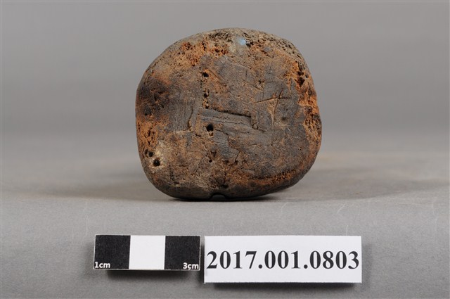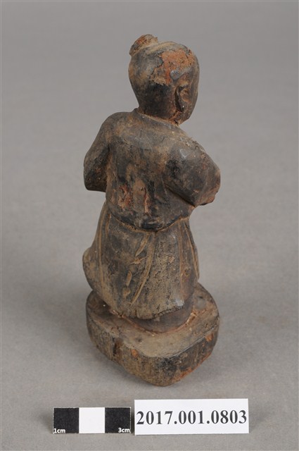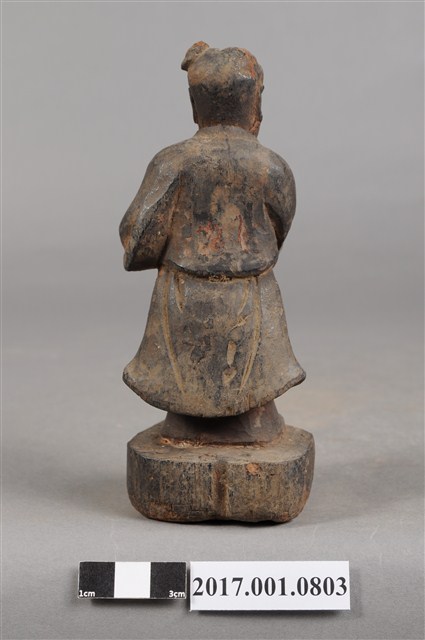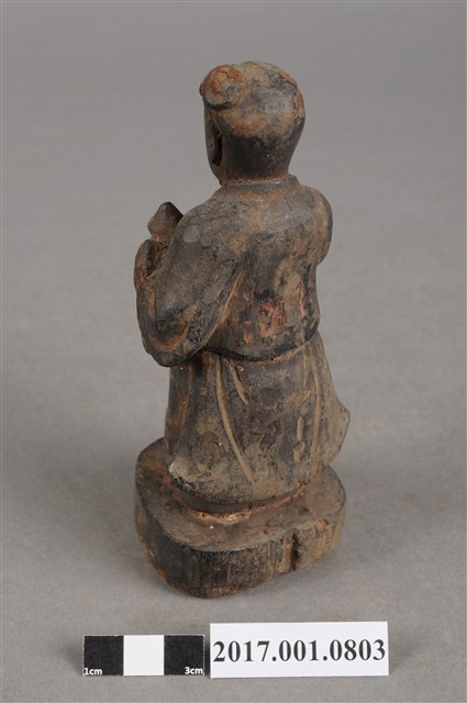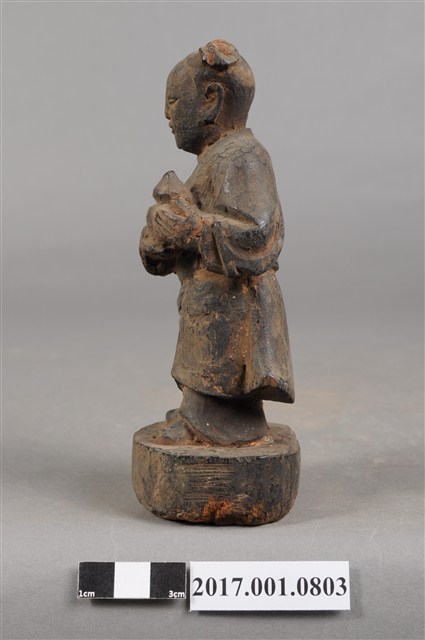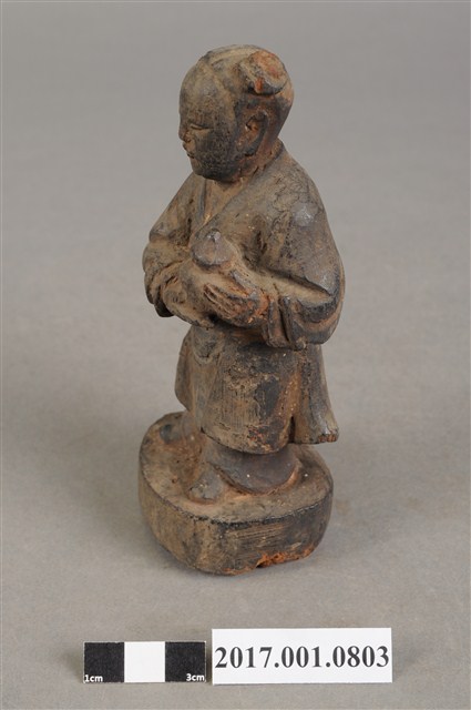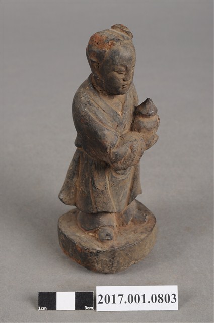 1.本件木雕童子像,作立姿姿態,表面施作塗裝粧佛技法,漆面保存完整。頭頂梳雙髻,右邊髮髻損毀,顏面表現幼童相貌。身著右衽窄袖長袍,腰繫布帶,腿著長褲,腳穿履。立像挺身以雙腳八字步的姿態站於臺座上。右手左伸,手掌托一只葫蘆,左手掌扶葫蘆左側。臺座平面近似圓形,側邊無裝飾。