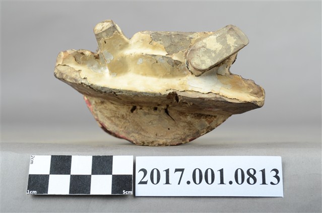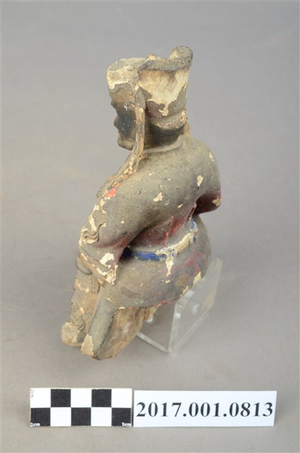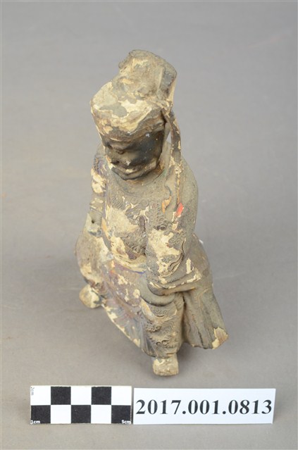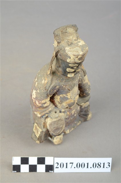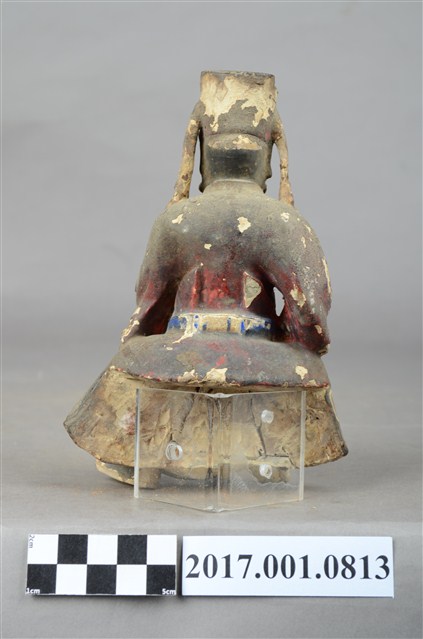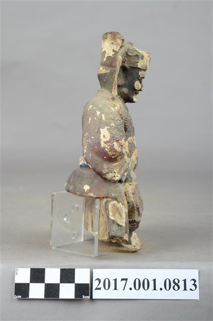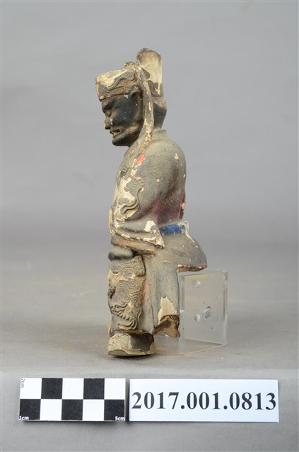 1.本件木雕雷府千歲像,作坐姿姿態,表面施作塗裝、安金不見紅粉雕粧佛技法,粧佛局部剝落。雷府千歲呈現鬼怪造形,眉骨凸出,凸眼圓睜,呲牙裂嘴,顏面有金圈,金圈僅存粉雕圓點,金漆剝落。頭戴幞頭,帽帶垂至肩上,身著寬袖蟒袍,腹部束有腰帶,袍服以粉雕盤飾蟒、海水江崖等紋飾。挺身端坐,雙足垂下,左手扶於左膝之上,右手握著腰帶。本件屬於「脫椅」作法,臺座已遺失。