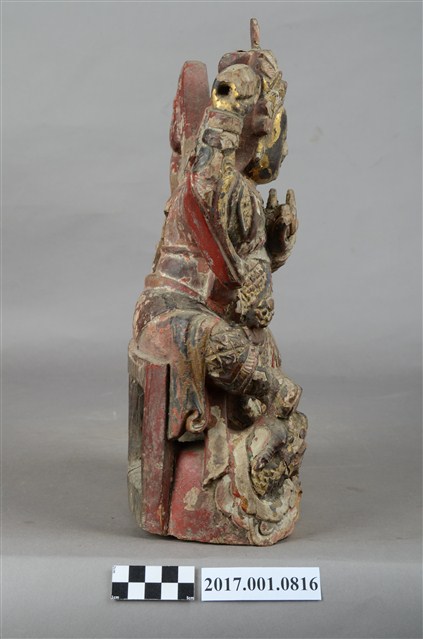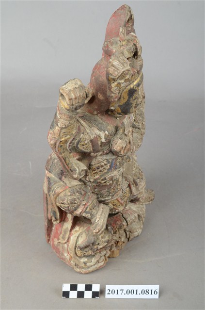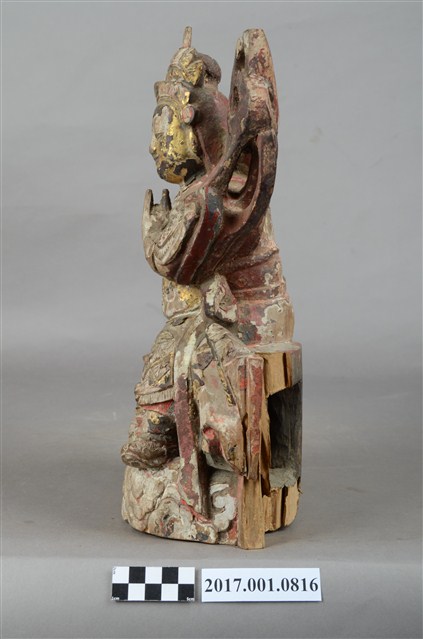 1.本件木雕楊泗將軍像採坐姿,端坐於臺座上,表面以錦雕彩繪安金飾成,粧佛大部分除去,神像背後有一長方形入神洞,入神物已取出,楊泗將軍作年輕男子相貌,頭戴兜鏊,身著甲袍,肩披飄帶,飄帶打結束於腰部,腳穿皂靴,甲袍雕飾以獅頭吞口、鎧甲鱗片等紋,腹部束腰帶,左手手掌持寶珠置於胸前,右手握拳舉於右側,手中持物遺失,左腳踏於水面,右腳踩龍頭。青龍從左邊穿入水面至右邊探頭,露出一截身軀。神像左手手腕有裂痕,底部有蟲蛀孔。