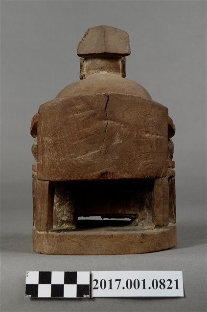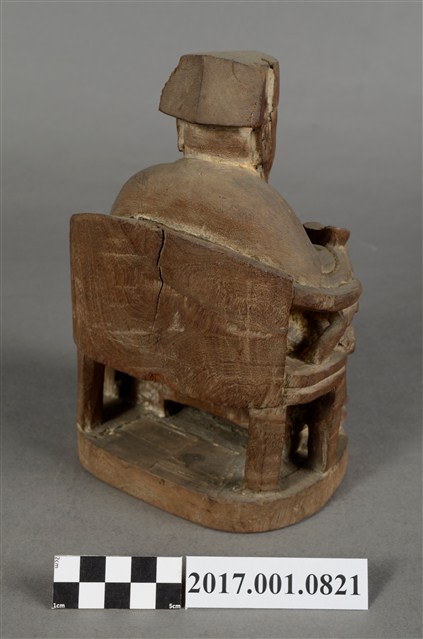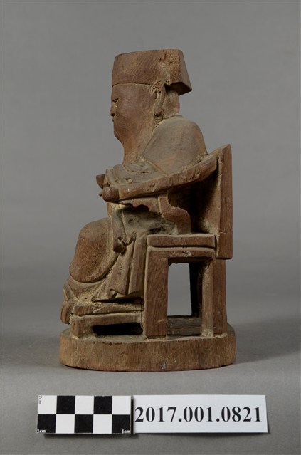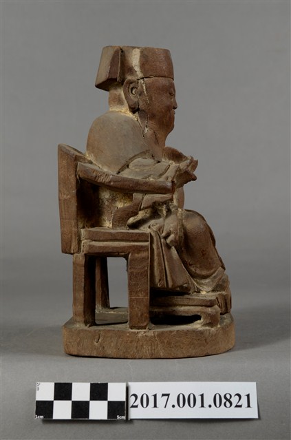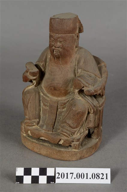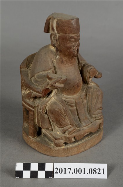 1.本件福德正神木雕像,造型較寬矮,福德正神頭戴圓巾,寬臉大耳,面貌慈祥,鬍鬚直接雕成雕一體成形,福德正神端坐寬版圈背椅上,身穿長袍,粧佛已除去,僅有衣褶線條,雙手擺放於圈背椅扶手之上,右手持元寶,左手掌斷裂不知手持何物。
