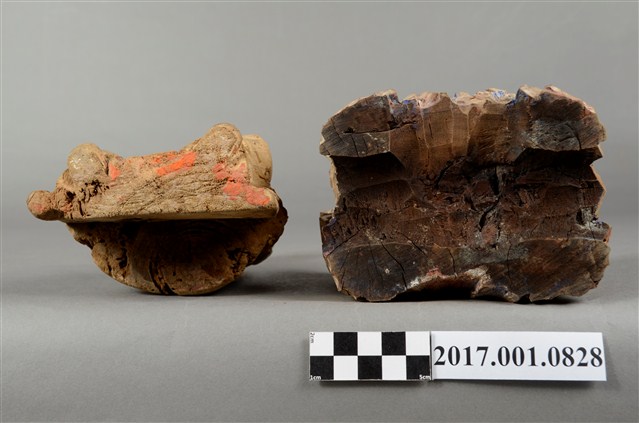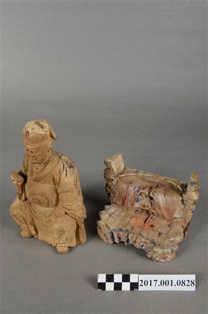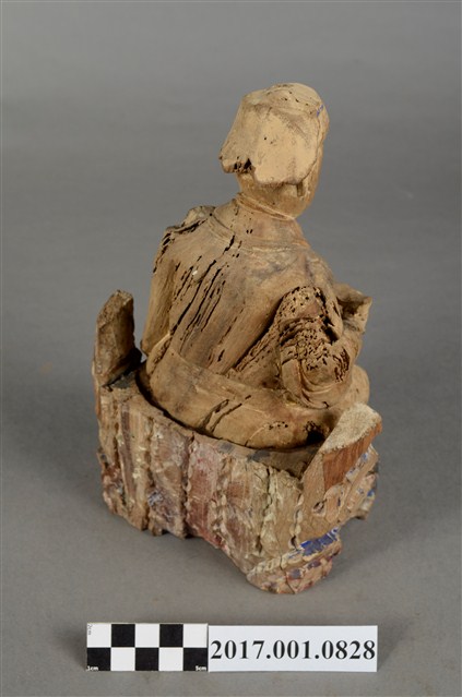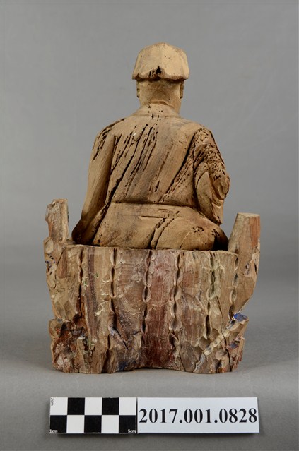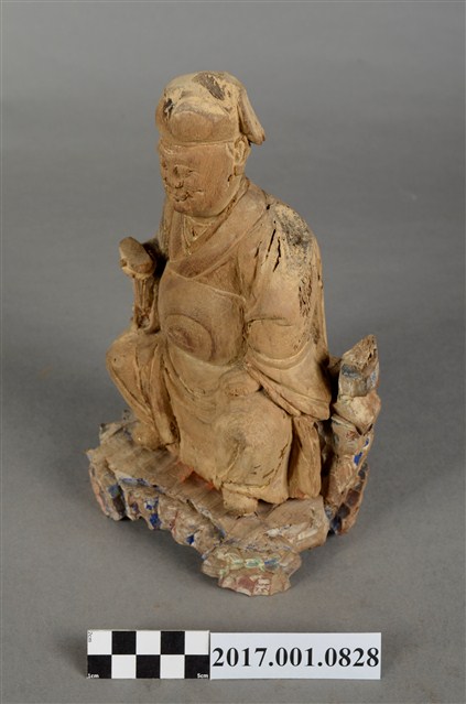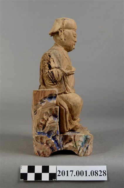1.本件福德正神像以木雕製成,造型古樸,粧佛已除去。福德正神頭戴圓巾,雙眼微開往前直視,臉上佈滿皺紋,嘴角留有植鬚的孔,其臉型與下巴圓潤為福氣的象徵。福德正神身穿長袍,坐姿端正,右手平持元寶,左手按於左膝之上,並端坐於木雕五彩岩座之上。本件福德正神為脫椅工法,與岩座可以分開。福德正神背後有數道蟲蛀孔與裂痕,蟲蛀狀況較為嚴重。