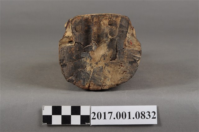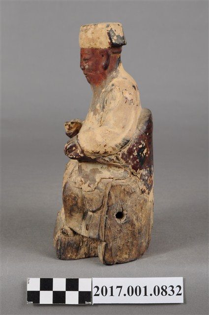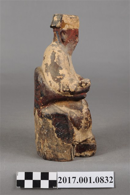1.本件福德正神為木雕製成,造型比例較為高瘦。福德正神臉色紅潤,面帶微笑,福德正神頭戴圓巾,身穿長袍,但因為身體風化表面剝落,因此服裝顏色與紋路已經無法辨識。福德正神端坐於圈背椅之上,左手握於扶手之上,右手持元寶,雙足踏於椅凳上。背後圈背椅有虎斑彩繪,代表福德正神坐著虎皮椅墊。