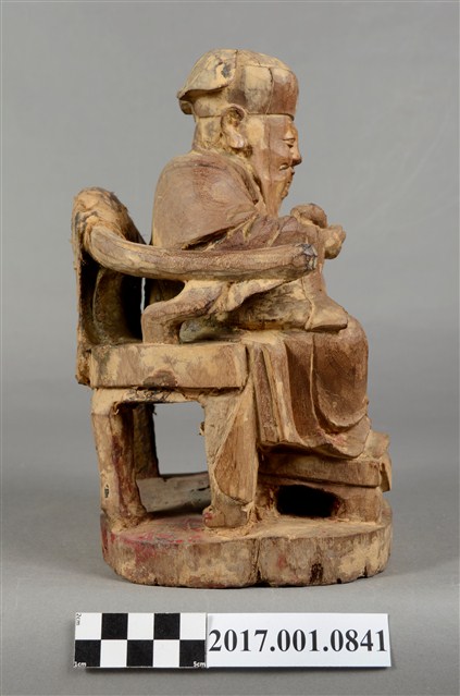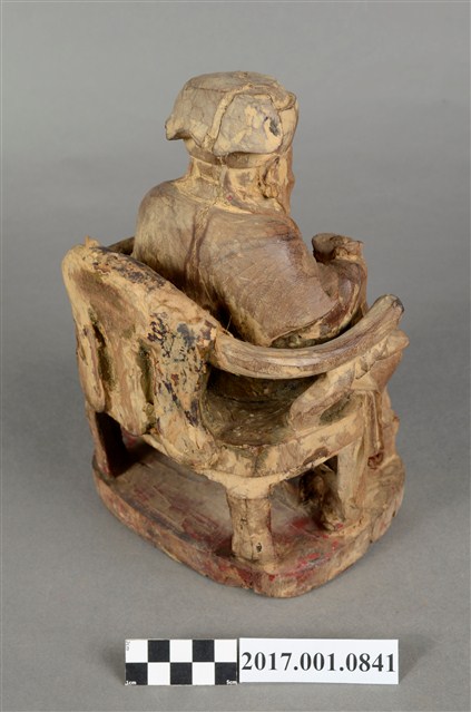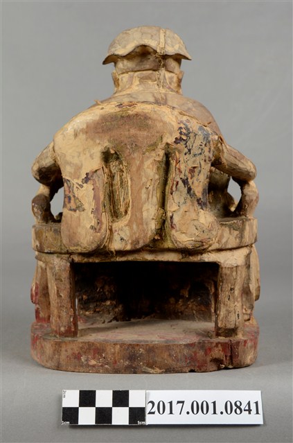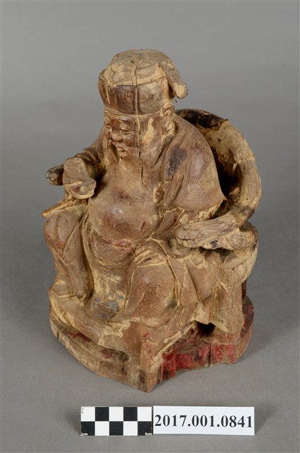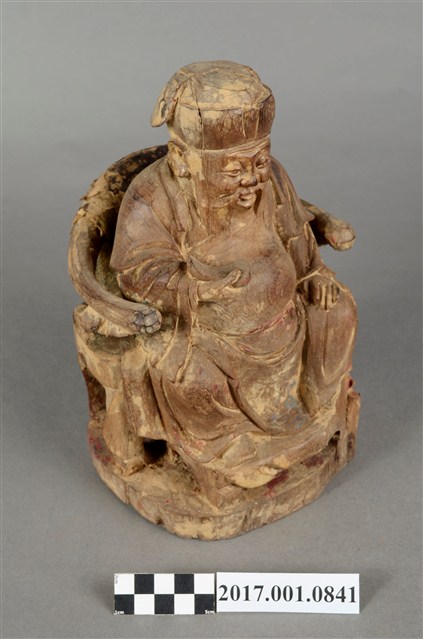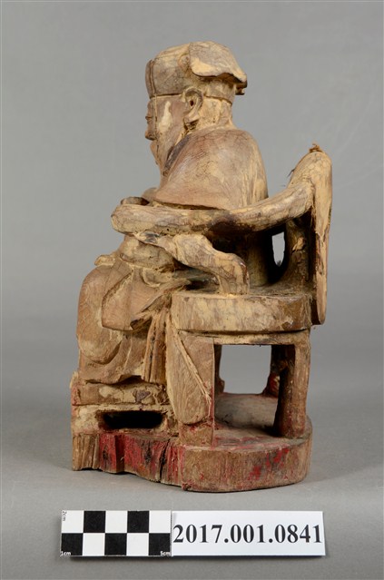 1.本件福德正神像以木雕塑成,並施以顏料彩繪粧佛。身軀矮胖。福德正神頭戴東坡巾,雙眼睜開,笑容可掬,身形福態,耳垂長是長壽福氣的象徵。身穿長袍,表面裝飾已除去,僅可看出以紅色與藍色為主要色系,右手持元寶,左手放置於左膝之上。福德正神端坐於圈背椅之上,雙足踏於椅凳上,左足削落不見。
