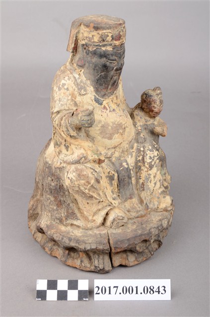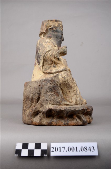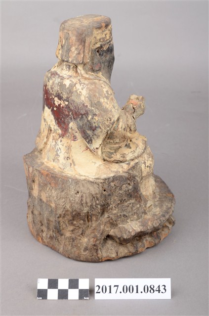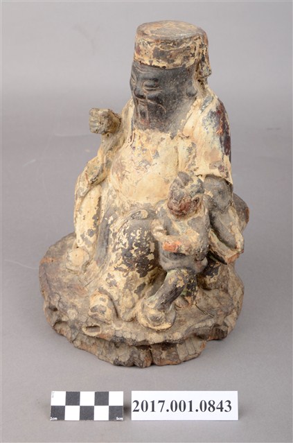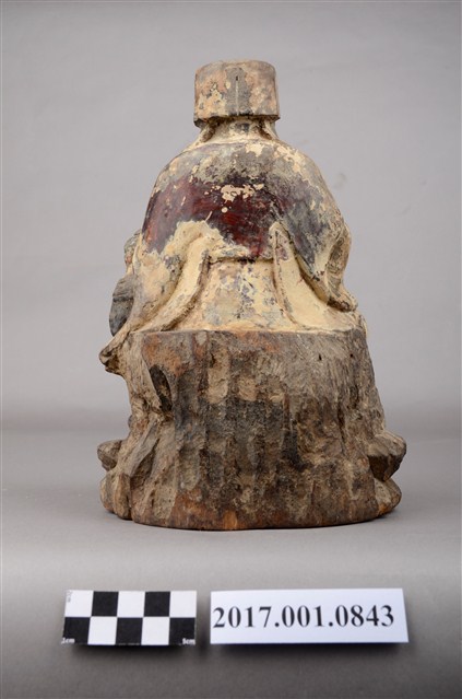 1.本件福德正神像以木雕製成,表面彩繪已經剝落大半。整體姿態輕鬆自然,端坐於岩座之上。福德正神頭戴東坡巾,臉色黝黑,雙目垂視,表情和藹可親。福德正神身穿長袍蓄鬚垂胸,長袍紋飾剝落無法辨識,福德正神左手牽著童子,右手則似乎握有拐杖,童子神情幼稚可愛,頭髮結髻,身穿布衣站立於福德正神左側。