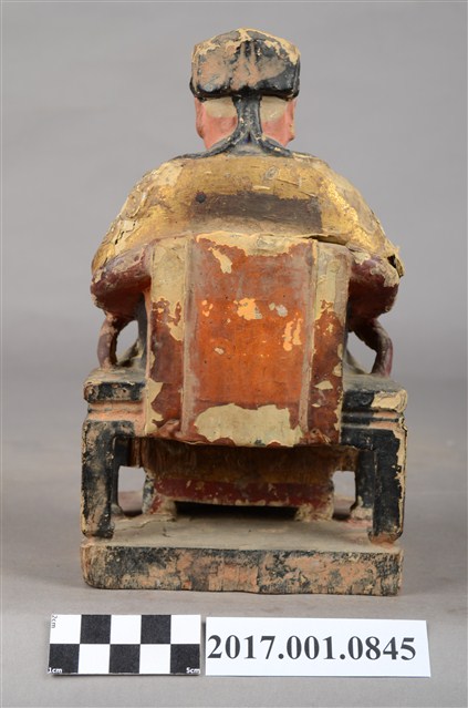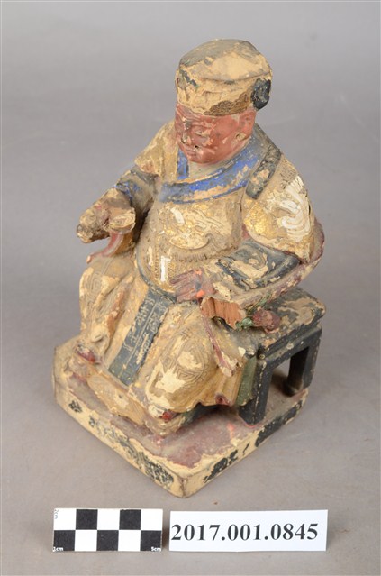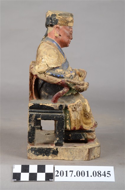 1.本件福德正神像為木雕,表面施以彩繪安金與粉雕粧佛。福德正神頭東坡巾,臉色紅潤,雙目垂視,蓄長髯,神態莊嚴。福德正神身穿金色長袍,端坐於圈背椅之上,長袍雙肩與雙膝處以漆線描繪團壽紋飾,腹部則以粉雕仙鶴圖案。裙擺劍帶上寫有福海壽山字樣裝飾,福德正神右手持元寶,左手倚放扶手。雙足踏於椅几上。