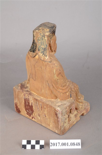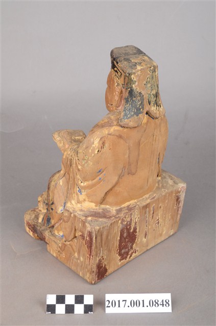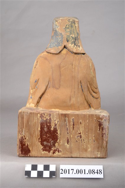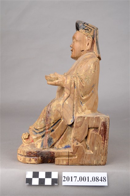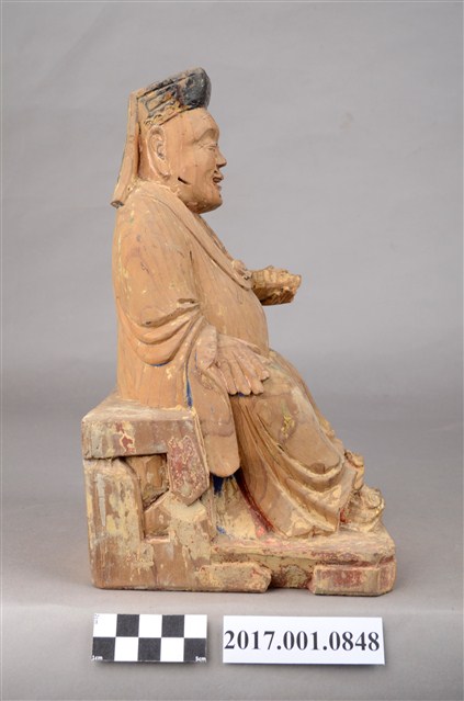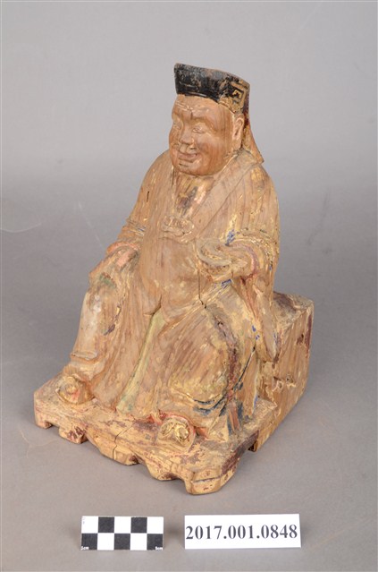 1.本件福德正神為木雕神像,表面施以彩繪粧佛,現彩繪層大半脫落,露出木胎原始顏色。福德正神頭戴方巾,額頭凸出,臉型豐腴,臉頰與下巴肥厚,其表情愉悅,笑容滿面。是福態之相。福德正神鼻子與嘴巴有三個植鬚孔,鬍鬚已經掉落。福德正神身穿長袍,端坐於臺座上,衣褶的線條表現流暢。其左手持元寶,右手按於右膝之上,坐姿端正,雙足穿著雲頭履,雕刻線條十分立體。
