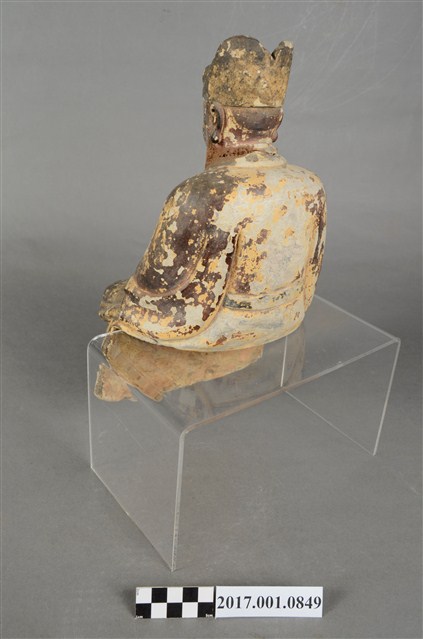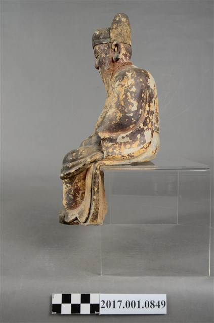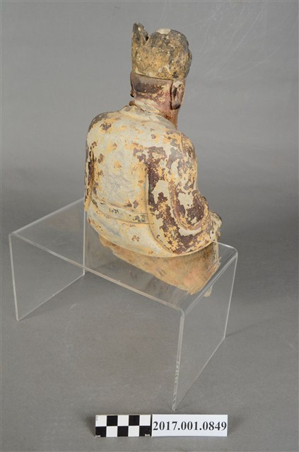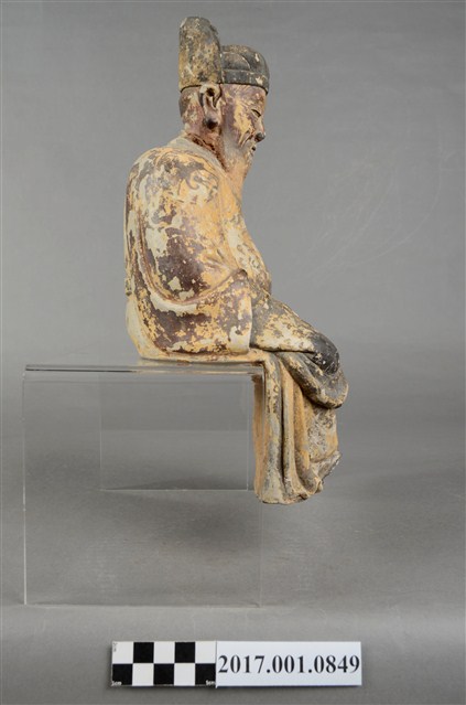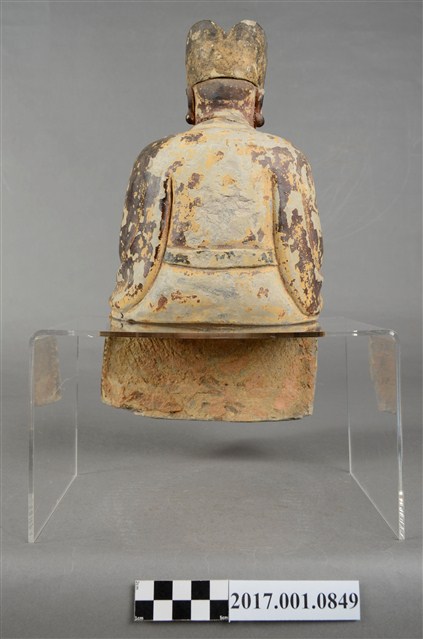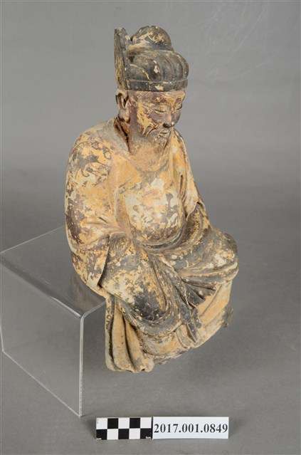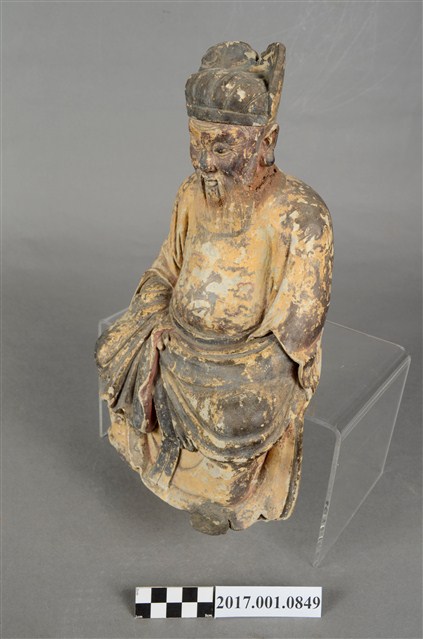 1.本件福德正神像為泥塑神像,造型古樸,姿態穩重。福德正神頭戴忠靖冠,雙眼微張,鬍鬚與身體塑為一體,面貌慈祥,耳垂且長為長壽福氣的象徵。福德正神身穿長袍,雙手放置於腹部採抱袖體姿態,雙手互握藏於袖中,僅露出右手食指。衣褶線條處理自然生動,作工精巧。福德正神採脫椅手法,神像與座椅分開,可以隨意替換。神像內部挖空。