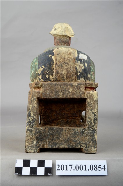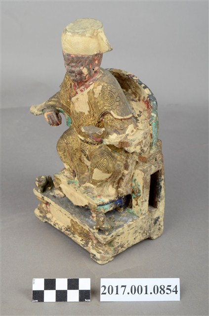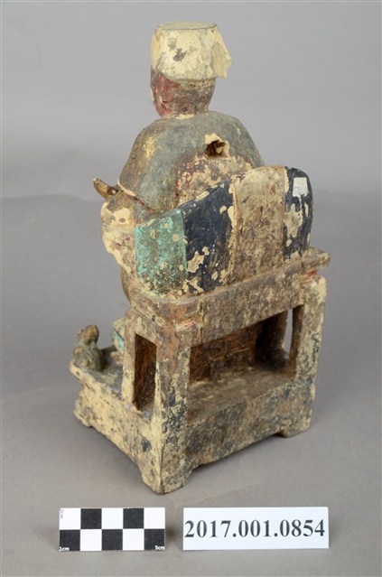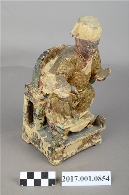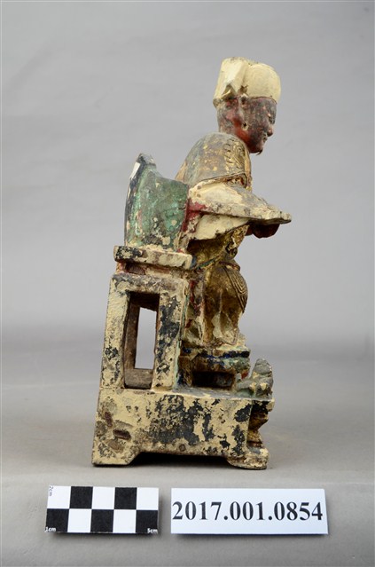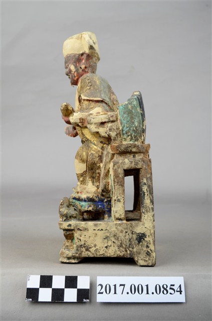 1.本件福德正神像以木雕製成,表面施以安金、粉線等工法,線條紋路細緻,神像整體造型華麗。福德正神頭戴方巾,臉色赭紅,神態莊重,臉部略為模糊、鬍鬚掉落。福德正神身軀前傾,身穿長袍,長袍在雙肩處以圓紋裝飾,雙膝處有壽字紋樣,腹部紋飾為仙鶴圖樣,粉線裝飾線條細膩而繁複。左手持元寶,右手倚靠於圈背椅扶手之上。福德正神踏於踏几之上,姿態生動,兩旁各有獅座,代表尊貴的象徵。福德正神端坐於圈背椅之上,椅腳處有雲紋裝飾,整體座椅比例過高。