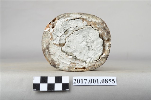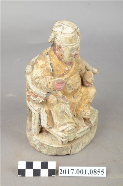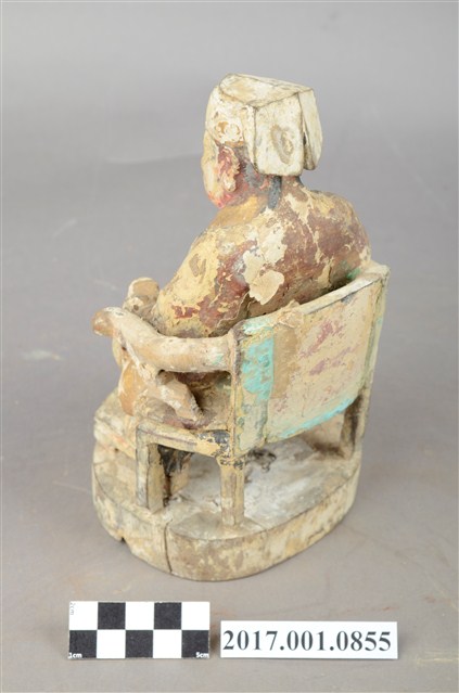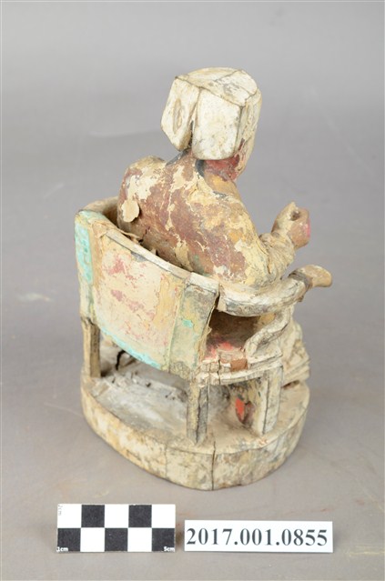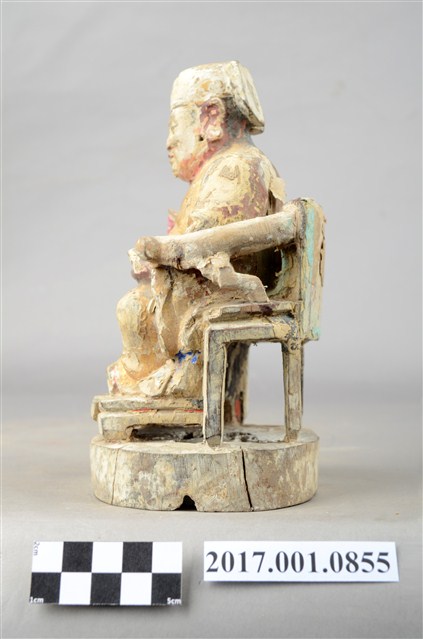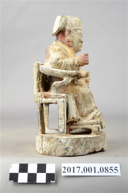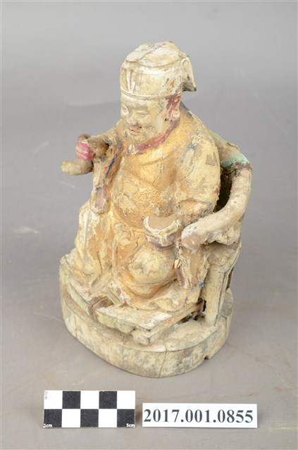 1.本件福德正神像以木雕製成,表面施以安金、粉線等工法,粧佛已除去,僅剩下部分線條,神像整體造型古樸端坐於圈背椅之上。福德正神頭戴員外巾,神態自若,面貌慈祥,臉部彩繪與鬍鬚已經掉落,只剩底漆附著。福德正神臉部轉向左側,且微向下看。福德正神身穿長袍,長袍雙膝與雙臂處有壽字紋樣,腹部紋飾已掉落。左手持元寶,右手握持拐杖,然已經遺失。手部顏色紅潤可看出底色原色。福德正神左腳斜擺,右腳直立,踏於踏几之上,姿態生動。