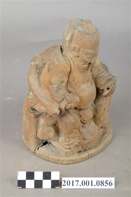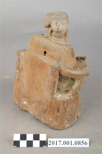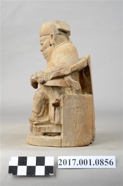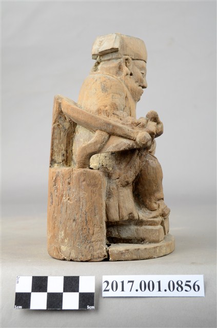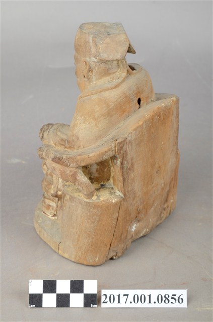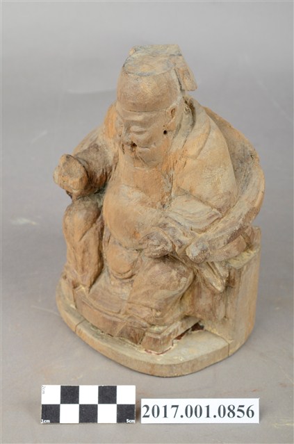 1.本件福德正神以木雕製成,表面粧佛已除去,線條圓弧,造型古樸十分福態,神像背後有一孔,可能為入香火之處。福德正神頭戴員外巾,圓臉大耳,豐腴有肉,代表福氣的象徵。福德正神表情慈祥,雙眼微張,面露微笑,為慈祥的老者樣貌。福德正神身穿長袍,外部紋樣已經無法辨識,左手放置於左膝上,右手持元寶,雙足踏於椅凳之上。臺座與神像本底連接處有裂開的跡象。